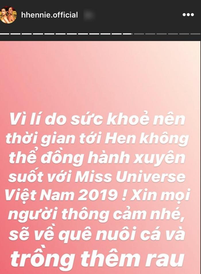Cận ngày phát sóng tập 1 Tôi là Hoa hậu Hoàn vũ Việt Nam 2019, fan sắc đẹp đang hóng chờ được nhìn thấy khoảnh khắc H'Hen Niê tỏa sáng với vai trò host của chương trình. Tuy nhiên, người đẹp Ê Đê bất ngờ đăng dòng trạng thái chia sẻ việc cô nàng không thể đồng hành xuyên suốt cuộc thi Miss Universe Vietnam năm nay vì lí do sức khỏe khiến người hâm mộ hoang mang.