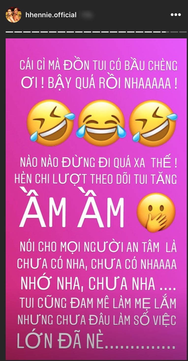 H'Hen Niê hài hước chia sẻ sau thông tin thiếu chính xác này, lượng follow của người đẹp cũng tăng lên đáng kể. Hoa hậu Hoàn vũ Việt Nam 2017 chia sẻ thêm cô nàng cũng đam mê làm mẹ, nhưng hiện tại vẫn chưa đến lúc.