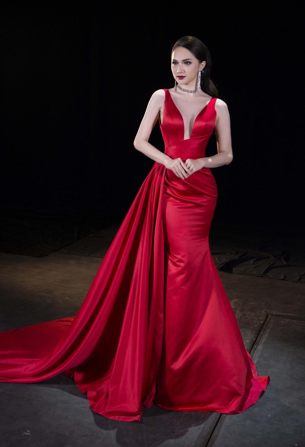 Phong cách quý phái và sang trọng của Hương Giang nổi bần bật trong thiết kế váy dạ hội thi Miss International Queen 2018.