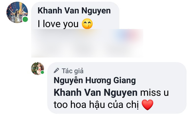 Khi thấy Miss Universe Vietnam 2019 bày tỏ sự nhớ nhung dành cho mình, Hương Giang trìu mến gọi: “Hoa hậu của chị. Chị cũng nhớ em”. Dù bận rộn với lịch trình dày đặc hậu đăng quang nhưng Khánh Vân vẫn vô cùng phấn khích và mong muốn sớm được hẹn hò Hoa hậu Chuyển giới Quốc tế.
