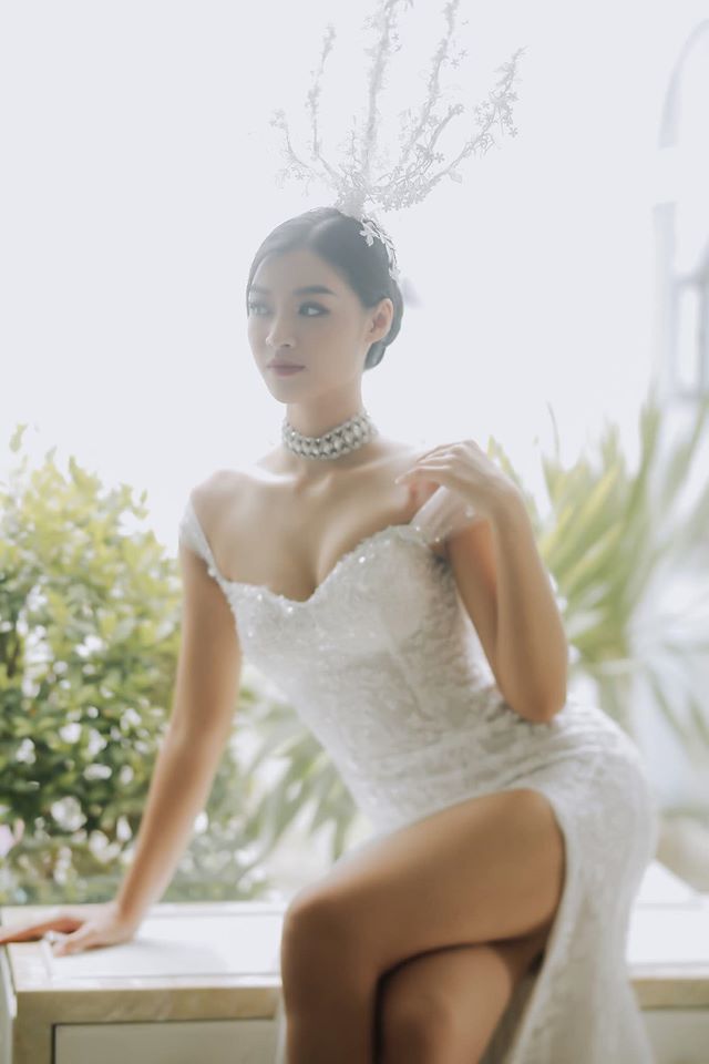 Diện váy cưới xẻ đùi cao, á hậu Kiều Loan pose dáng gợi cảm.