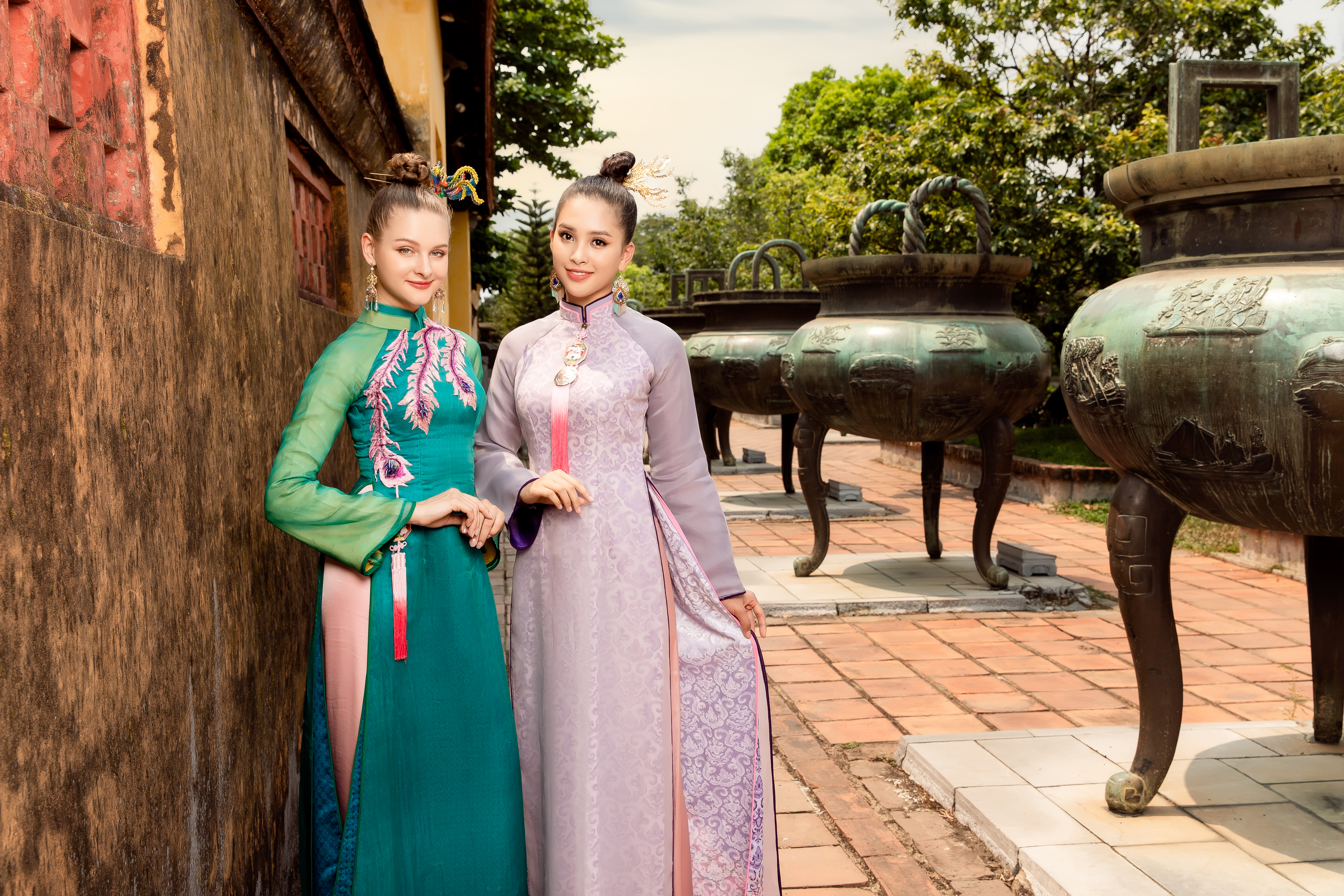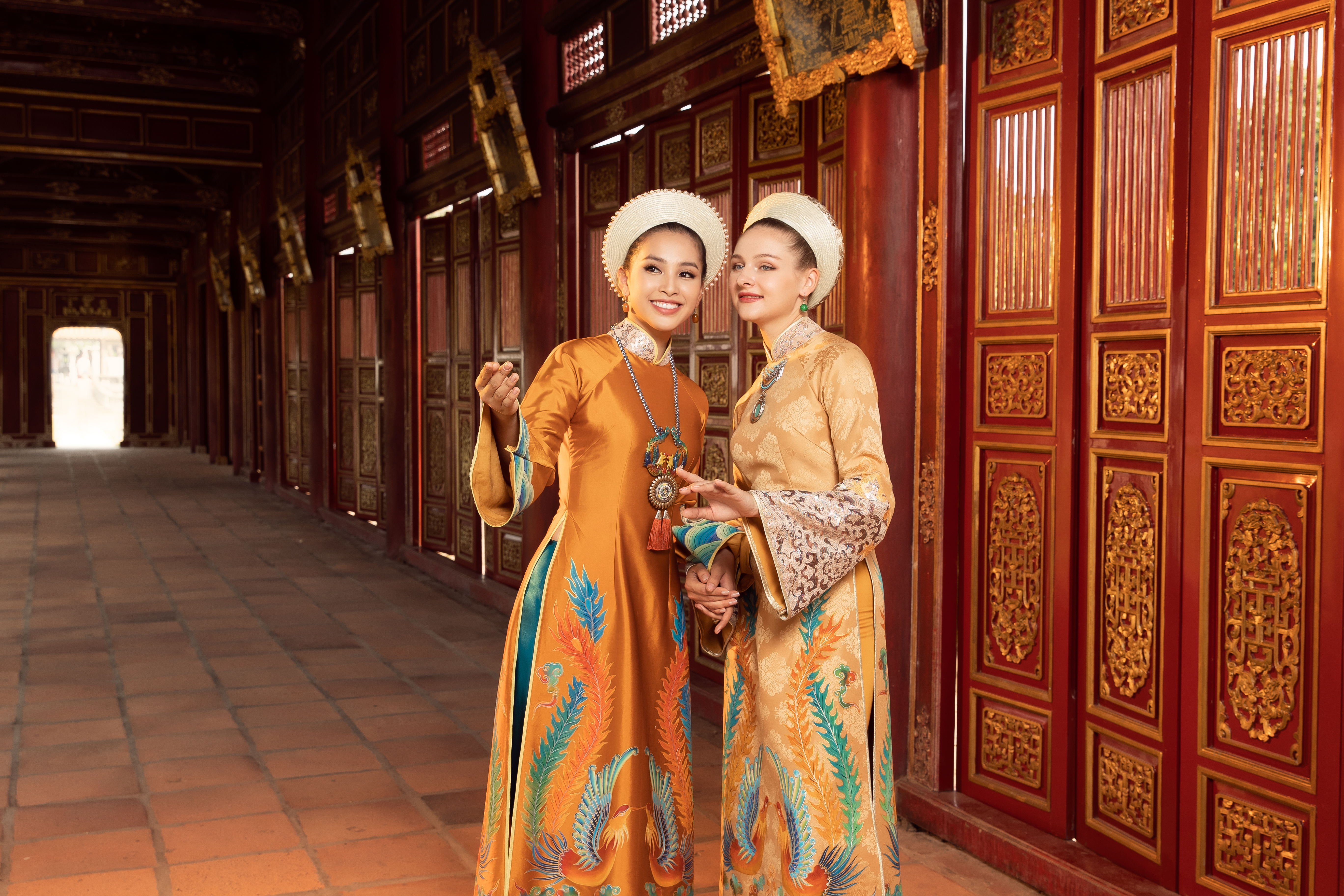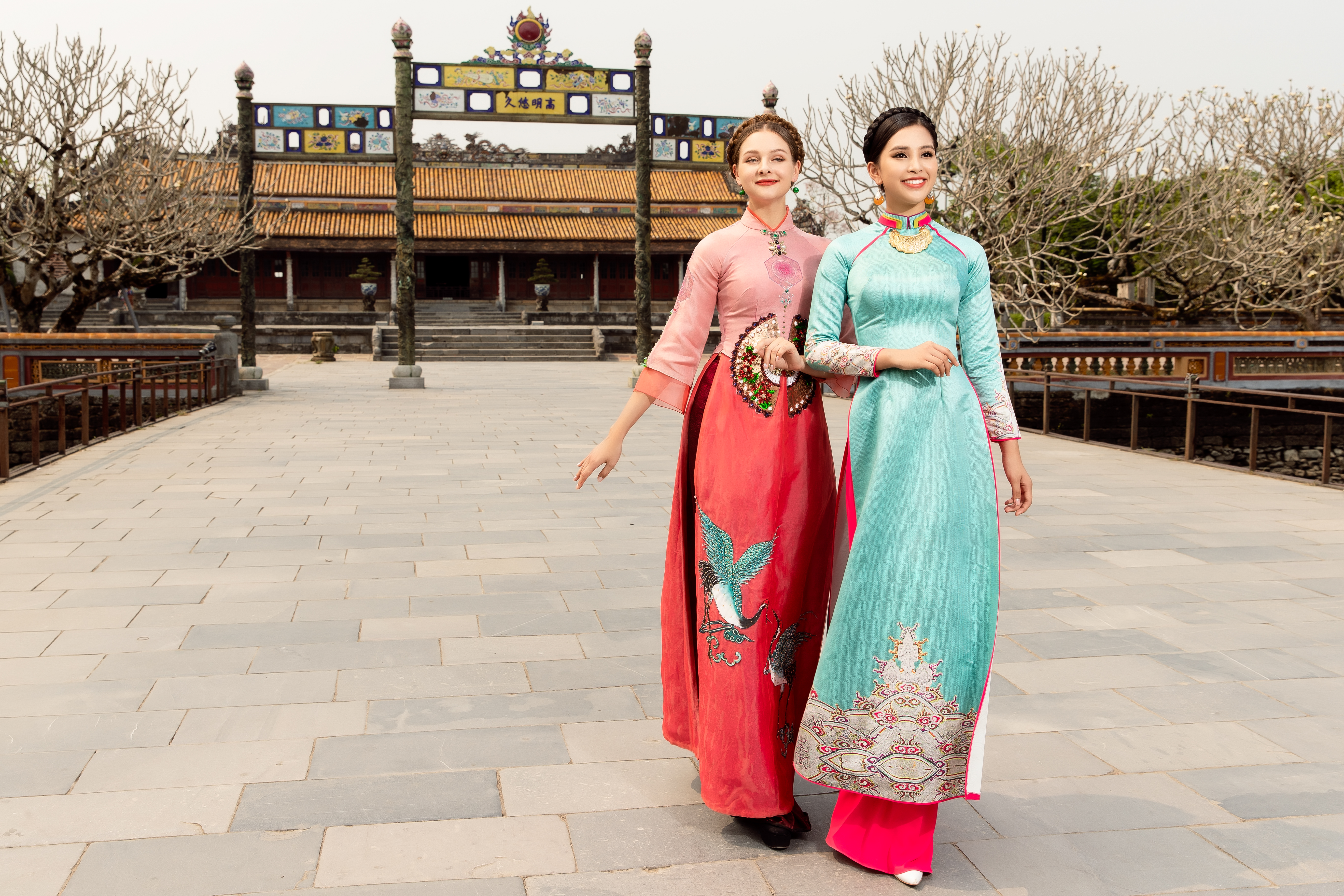 Lấy ý tưởng từ tà áo dài với những họa tiết mang đậm màu sắc truyền thống như chim công, chim phượng được thêu vẽ tỉ mỉ, Tiểu Vy xuất hiện bên cạnh nàng mẫu Tây - Anna các thiết kế của NTK Thiện Khánh. Màu sắc của mỗi bộ trang phục được lựa chọn cũng đầy tinh tế, nhã nhặn và phù hợp với toàn bộ khung cảnh cố đô.