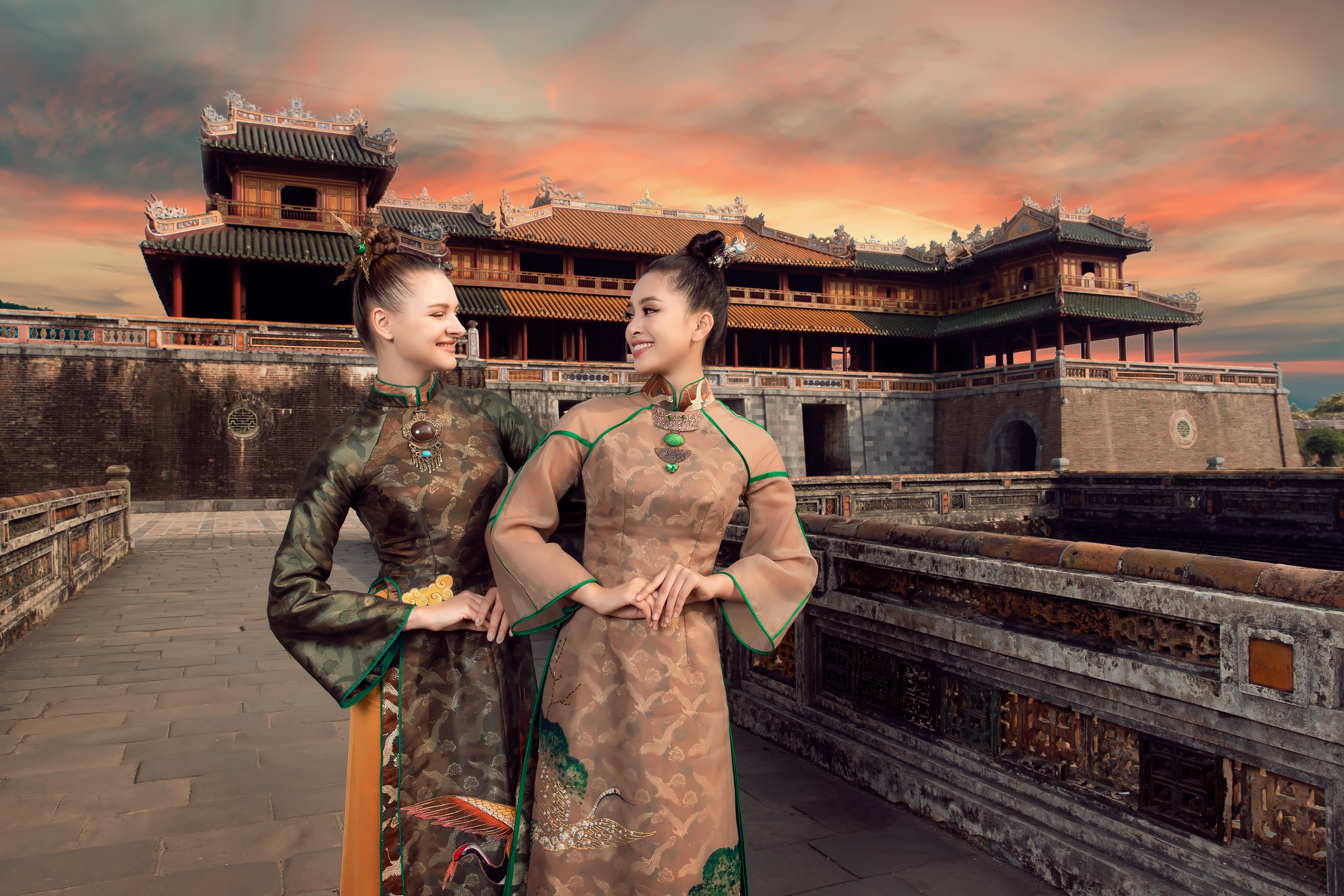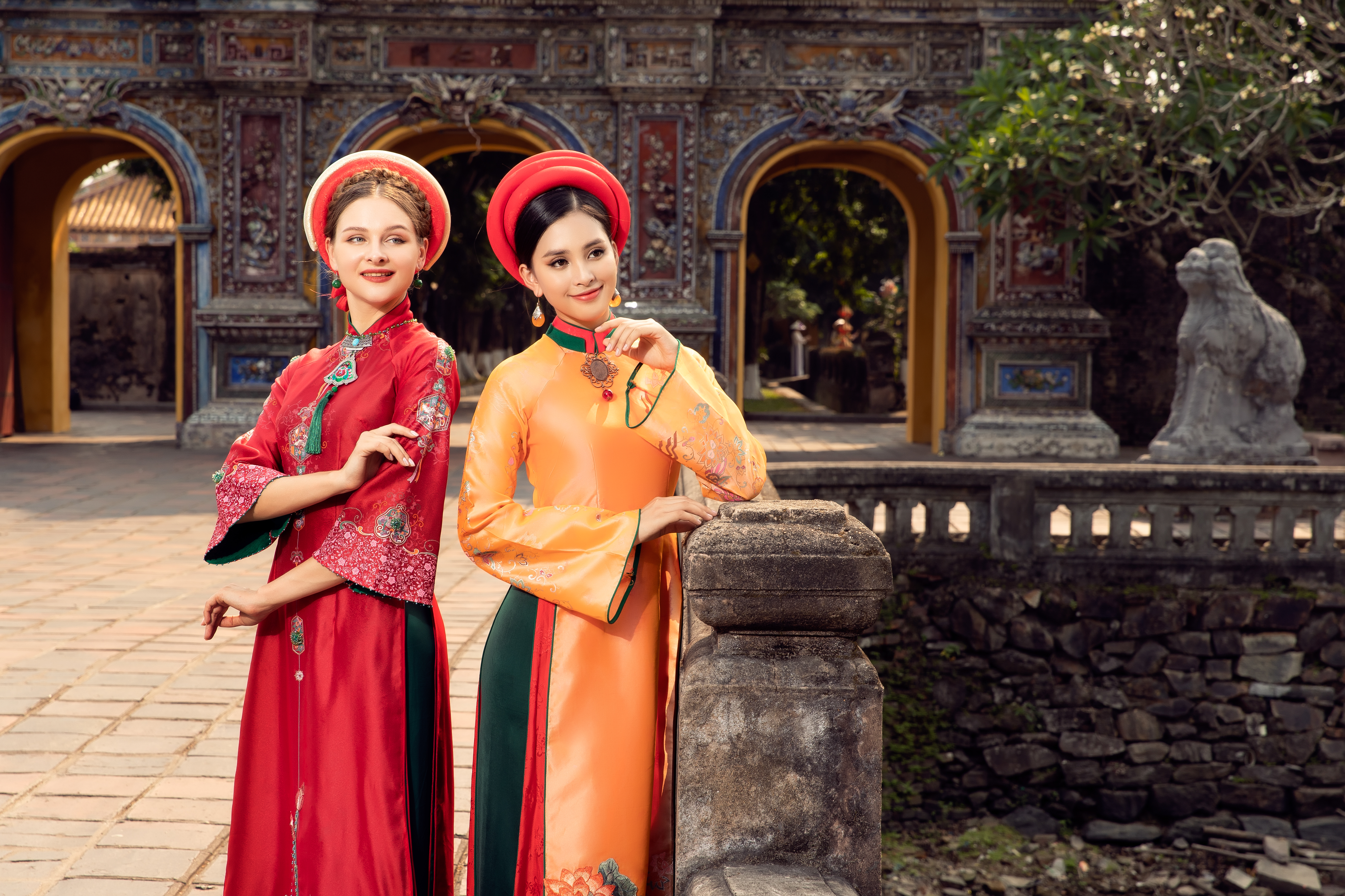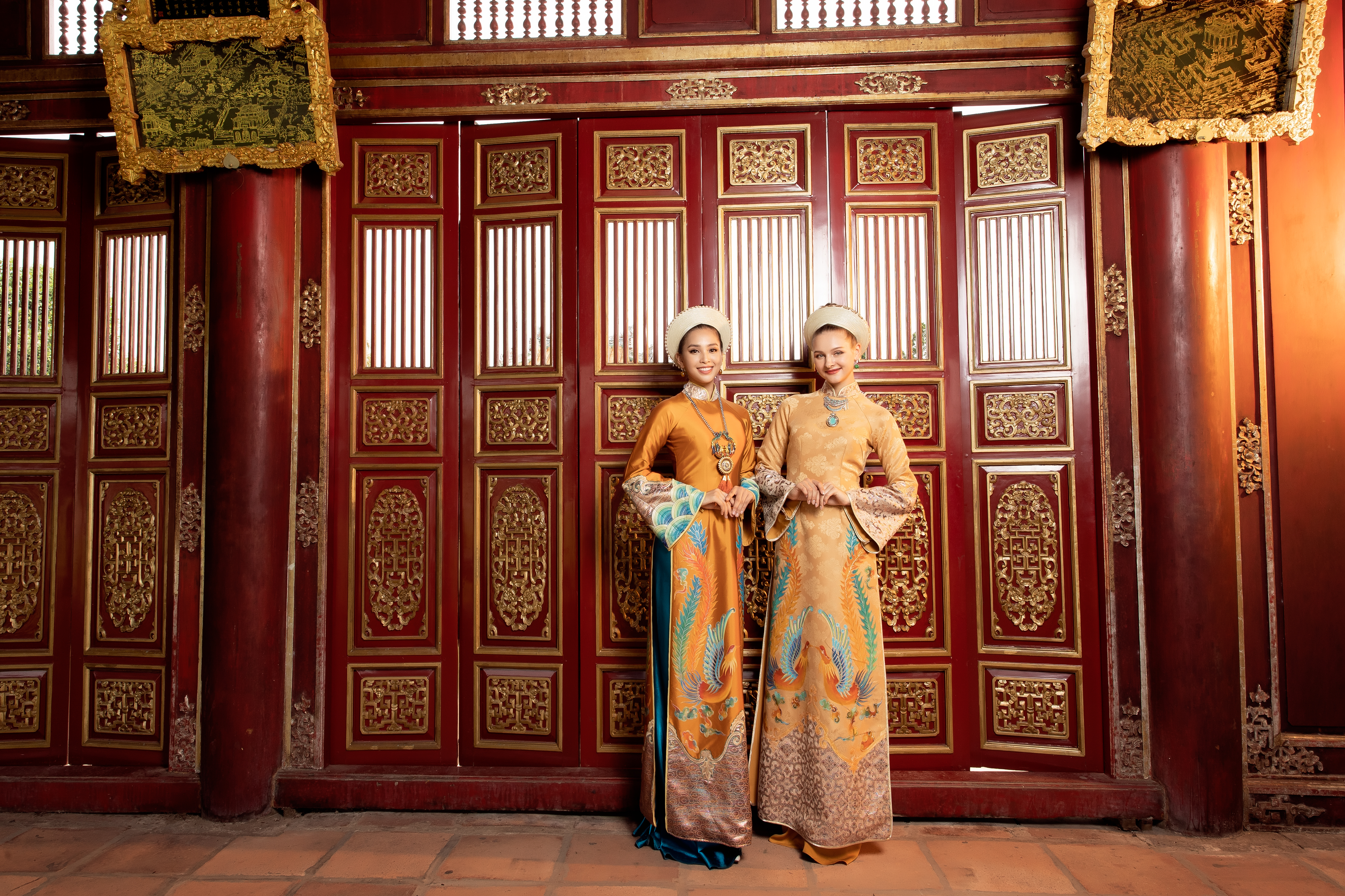 Lấy ý tưởng từ tà áo dài với những họa tiết mang đậm màu sắc truyền thống như chim công, chim phượng được thêu vẽ tỉ mỉ, Tiểu Vy xuất hiện bên cạnh nàng mẫu Tây - Anna các thiết kế của NTK Thiện Khánh. Màu sắc của mỗi bộ trang phục được lựa chọn cũng đầy tinh tế, nhã nhặn và phù hợp với toàn bộ khung cảnh cố đô.