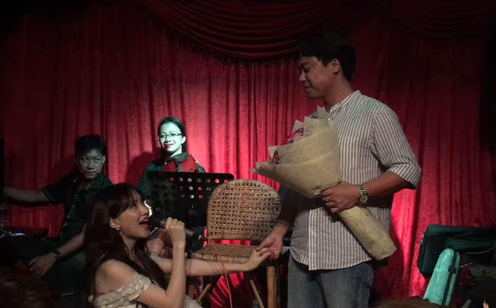 Hoà Minzy quỳ gối cầu hôn bạn trai tại một phòng trà ấm cúng và lãng mạn.