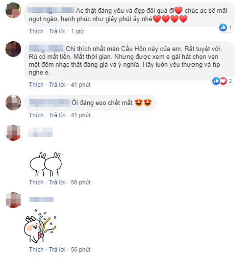 Mượn lời bài hát Cầu hôn với những ca từ vô cùng dễ thương và đáng yêu. Cả cô và bạn trai của mình đã có màn song ca ăn ý với sự hò hét của khán giả yêu mến và ủng hộ cô suốt thời gian qua. Chuyện tình đi qua 2 năm của họ không giống như các cặp đôi khác, như cô chia sẻ: “Thường ngày kỉ niệm tình yêu , ngày lễ những người yêu nhau thường sẽ có đôi có cặp đi chơi đi nghe nhạc nè. Nhưng khi yêu 1 nghệ sĩ điều đó không còn giống được như người bình thường nữa. Ngày nào là ngày Lễ của mọi người thì lại toàn đi diễn đến cả ngày hôm qua kỉ niệm tình yêu cũng không được hẹn hò với nhau”.