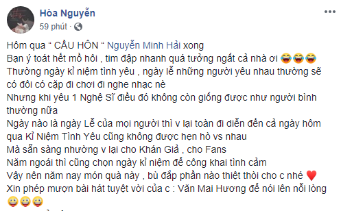 Dòng trạng thái chia sẻ cảm xúc của Hòa Minzy và bạn trai sau lời cầu hôn.