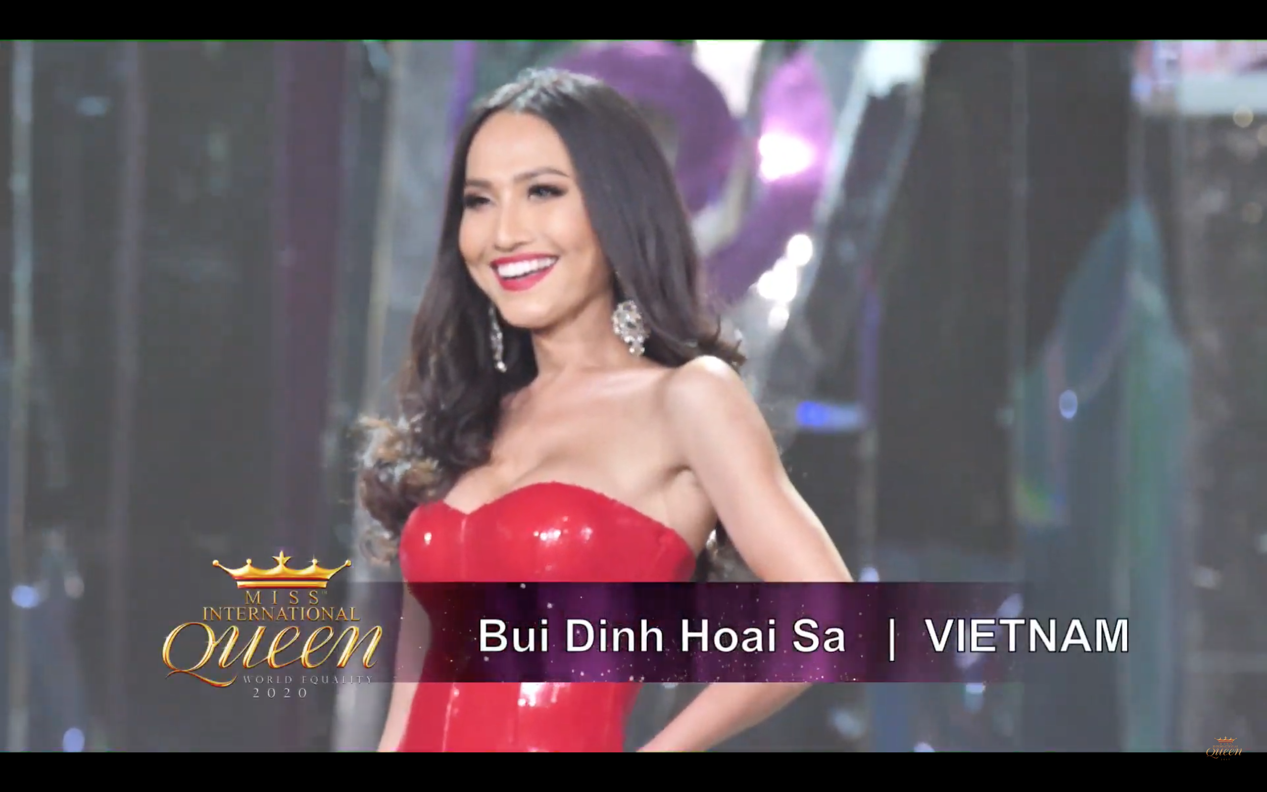 Là thí sinh giữ vị trí trình diễn cuối cùng trong tất cả các phần thi tại Miss International Queen 2020, đại diện Việt Nam - Bùi Đình Hoài Sa luôn biết cách ghi dấu ấn bằng những bước đi đẹp mắt. Xuất hiện như Vedette, người đẹp gốc An Giang khoe nhan sắc cuốn hút và nụ cười rạng rỡ. Hoài Sa từng chia sẻ cô cảm thấy tự tin nhất khi cười. Đây cũng chính là một trong những “tuyệt chiêu” gây sức hút của á quân Chinh phục hoàn mỹ 2018 tại đấu trường nhan sắc quốc tế năm nay.