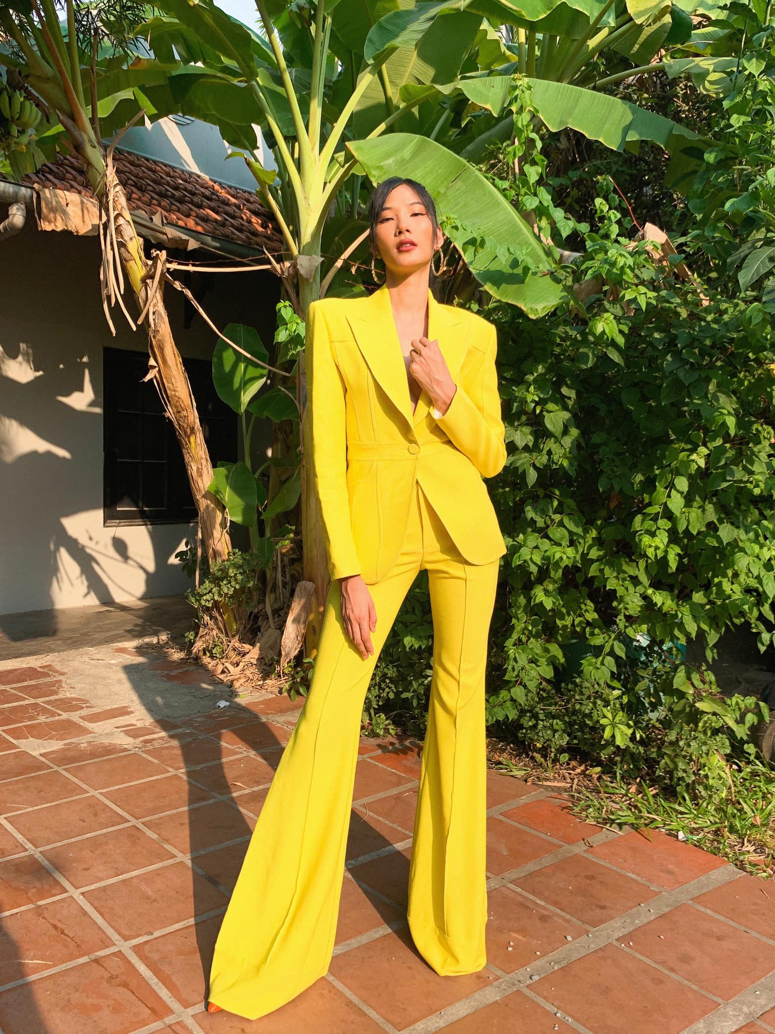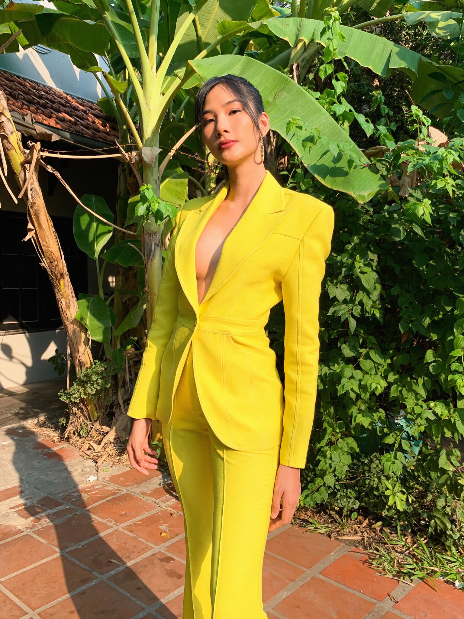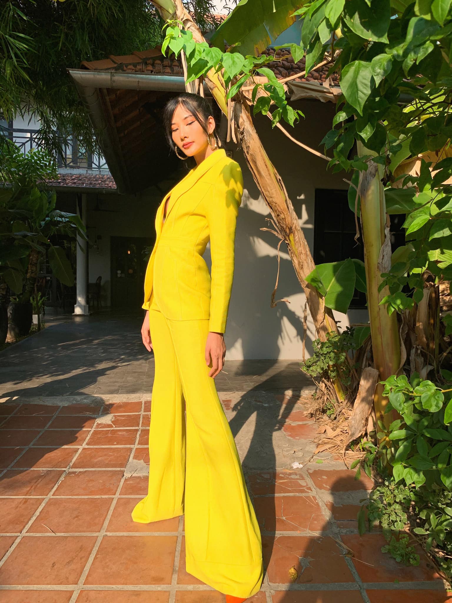 Á hậu Hoàng Thùy nổi bật với bộ suit vàng rực khoe vòng 1 gợi cảm và đôi chân dài miên man. Đây là mẫu thiết kế từng được người đẹp diện trong phần phỏng vấn kín tại Miss Universe 2019. Người đẹp Thanh Hóa từng gây ấn tượng mạnh mẽ với fan khi xuất hiện với tâm thế vô cùng tự tin và bản lĩnh, đối diện với ban giám khảo để trả lời câu hỏi mà không cần đến phiên dịch.