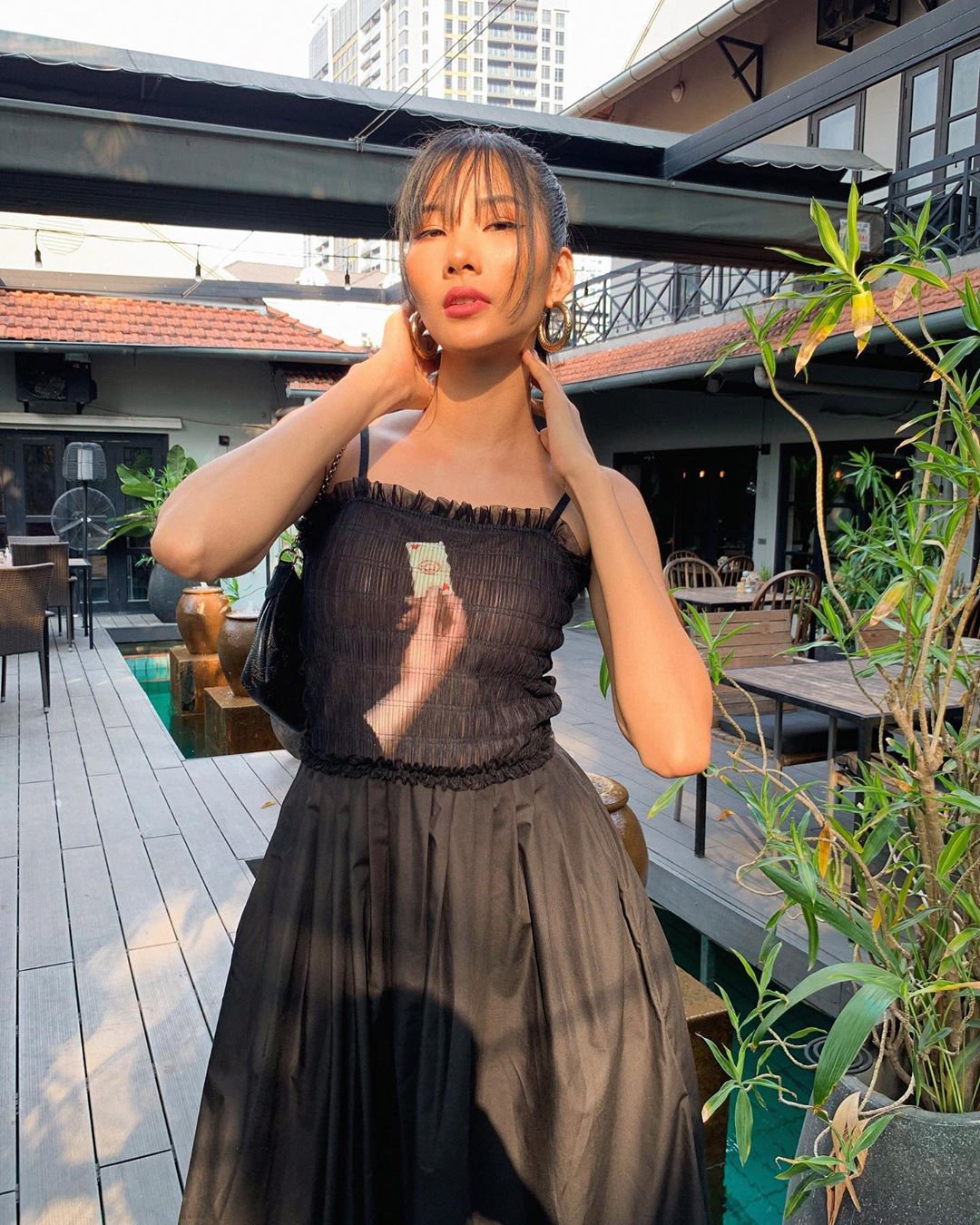 Hoàng Thùy tiếp tục khoe phong cách thời trang ấn tượng do cô nàng tự phối. Diện váy 2 dây khoe vai trần gợi cảm, chân dài 1992 ghi điểm với đôi boot trắng dáng cao.