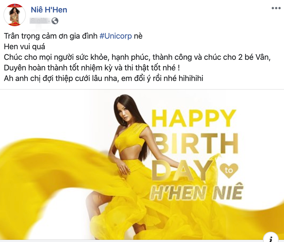 Mừng sinh nhật H’Hen Niê ở tuổi 28, Khánh Vân và Kim Duyên cùng ê-kíp Miss Universe Vietnam gửi lời chúc đặc biệt đến nàng hậu. Khánh Vân không khỏi xuýt xoa trước hình thể và nhan sắc của người đẹp Ê Đê, cô nàng không ngại khen “nhìn chị Hen… ngon”. Á hậu Kim Duyên đốc thúc H’Hen Niê sớm lấy chồng để cô được bưng quả. Bên cạnh đó, nhiều thành viên trong ê-kíp còn tiết lộ trong thời gian đương nhiệm H'Hen Niê có mong ước lấy chồng. Thế nên, khi hoàn thành nhiệm kỳ, mọi người hối thúc nàng hậu sớm làm đám cưới.