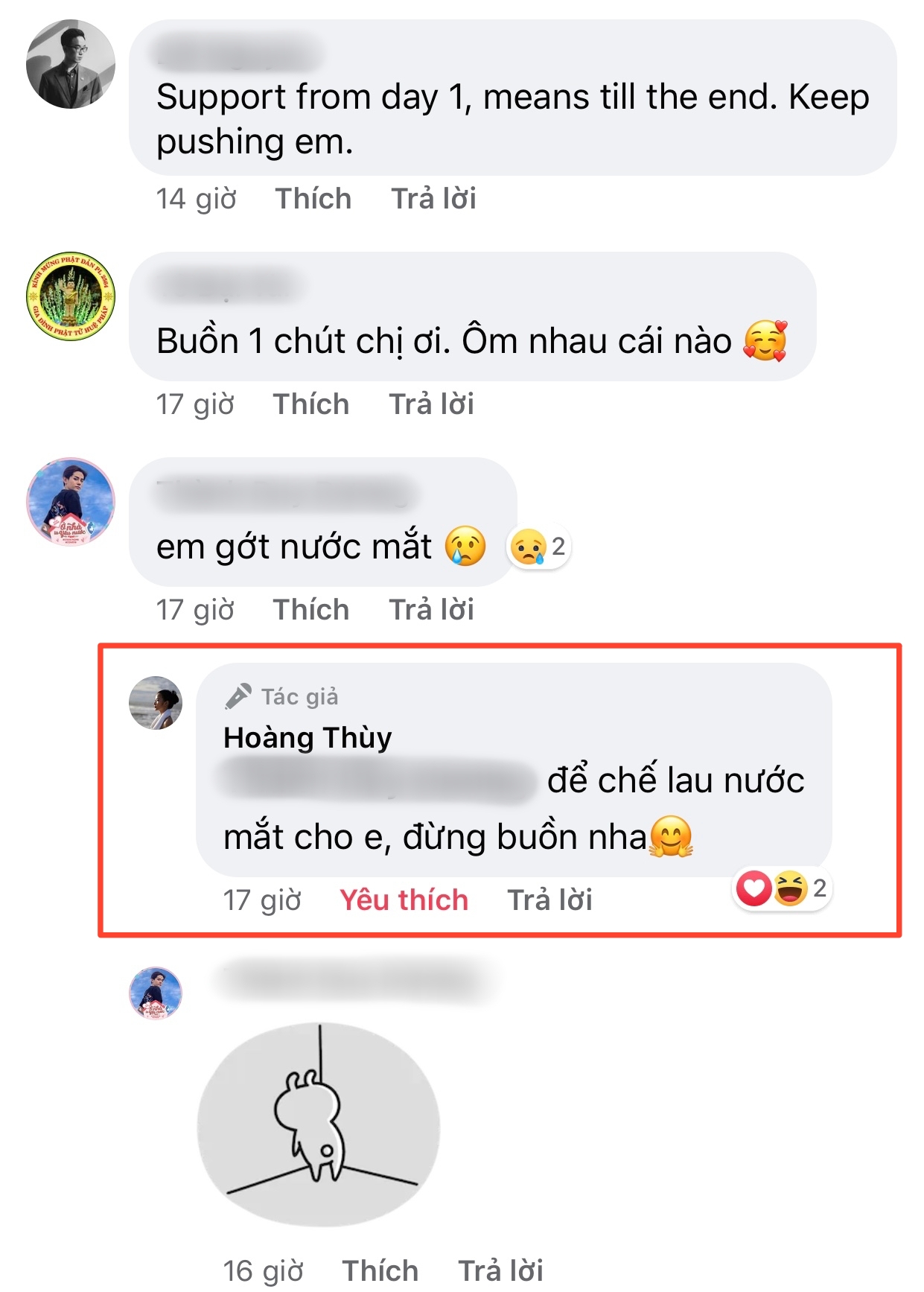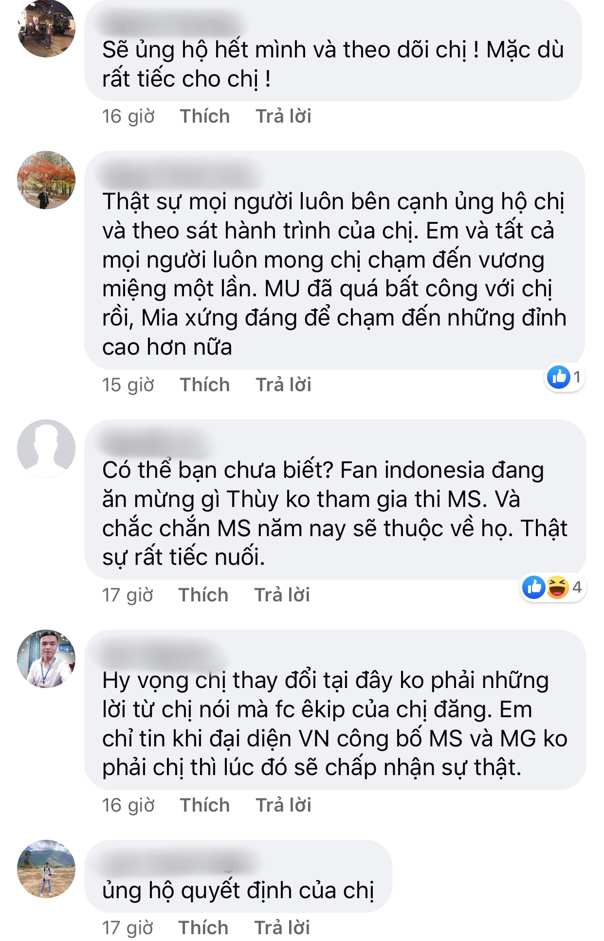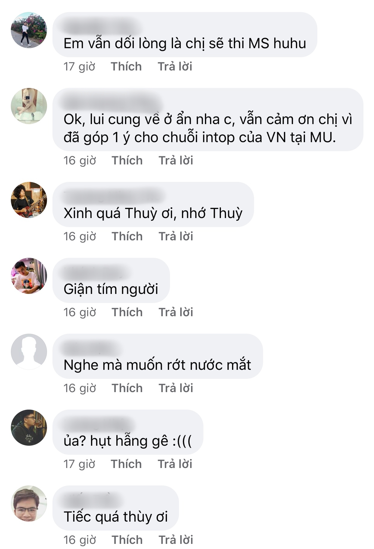 Bên dưới bài viết chia sẻ về quyết định này, nhiều khán giả bày tỏ sự nuối tiếc dành Hoàng Thùy vì ở thời điểm hiện tại nhan sắc của cô nàng gần như là hoàn hảo và chỉ chờ đến thời điểm để tỏa sáng nếu một lần nữa tham gia một cuộc thi sắc đẹp quốc tế. Hiểu được tình cảm của người hâm mộ dành cho mình, Top 20 - Miss Universe 2019 đã có những lời an ủi gần gũi: “Để chị lau nước mắt cho, đừng buồn nha” hay “Đừng buồn nữa, Thùy sẽ đền bù cái khác“…