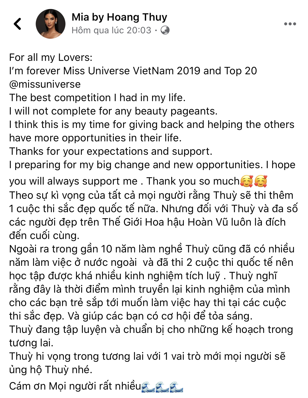 Hoàng Thùy an ủi người hâm mộ sau quyết định không tham gia bất kì cuộc thi nhan sắc quốc tế nào nữa.