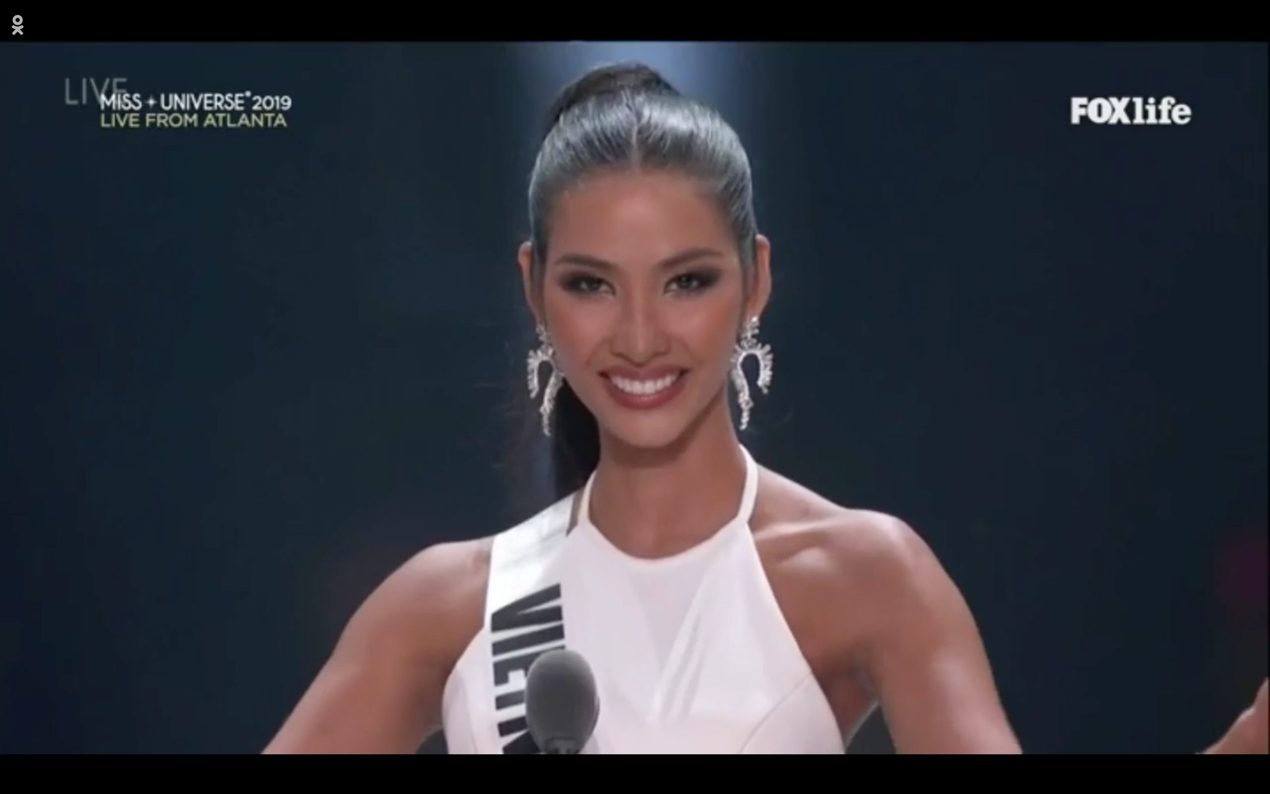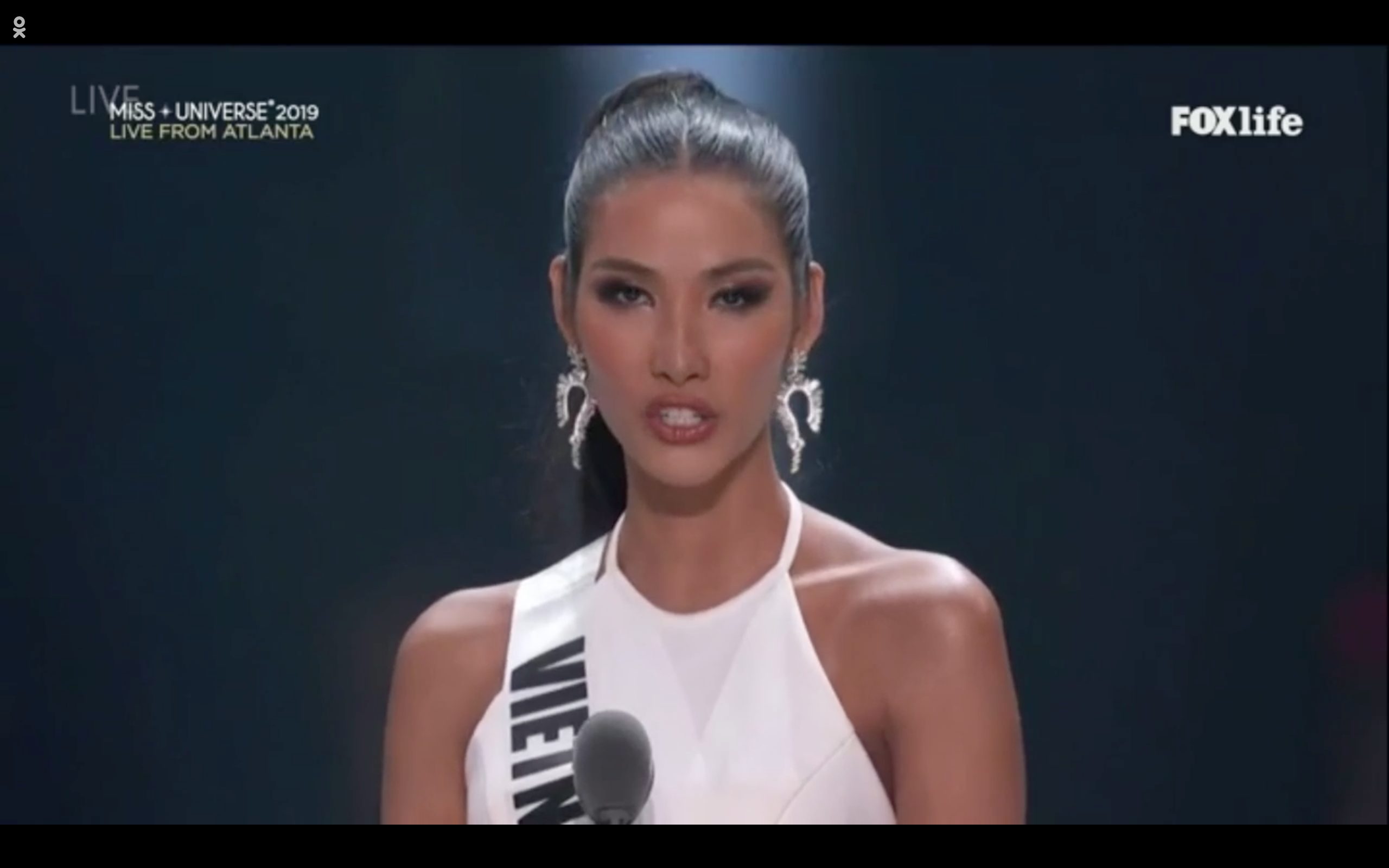 Tự tin đi về phía trung tâm sân khấu, đại diện Việt Nam - á hậu Hoàng Thùy dõng dạc chia sẻ về câu chuyện cô nàng mang đến Miss Universe 2019. So với thời “I love New York”, người đẹp Thanh Hóa giờ đây vô cùng tỏa sáng và bản lĩnh với khả năng tiếng Anh lưu loát.