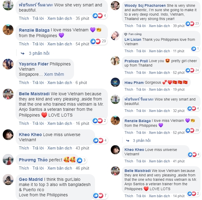 Nhiều fanpage quốc tế theo dõi cuộc thi Hoa hậu Hoàn vũ 2019 đã chia sẻ hình ảnh Hoàng Thùy và nhận lượng tương tác “khủng” từ người hâm mộ. Fan Philippines khen ngợi cách chọn trang phục thông minh của đại diện Việt Nam. Không ít bình luận đến từ dân mạng nước này còn khẳng định: “Ngoài Hoa hậu Hoàn vũ Philippines - Gazini Ganados, tôi thích và ủng hộ Hoàng Thùy“.