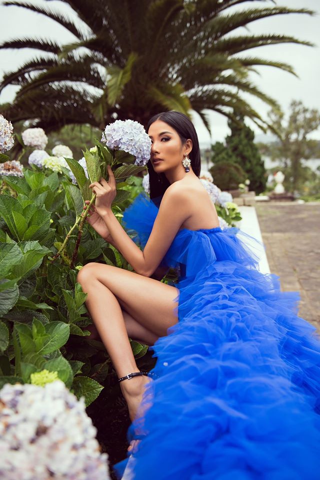 Lựa chọn 1 chiếc váy bồng bềnh màu xanh, á hậu tự nhận mình là “Blue Queen”. Với thiết kế phồng phần ren đầy mê hoặc, Hoàng Thùy đã hóa thân thành một quý cô đầy sự ngọt ngào. Phần đuôi váy kéo dài khiến nhiều người liên tưởng tới chiếc đuôi của nàng tiên cá.