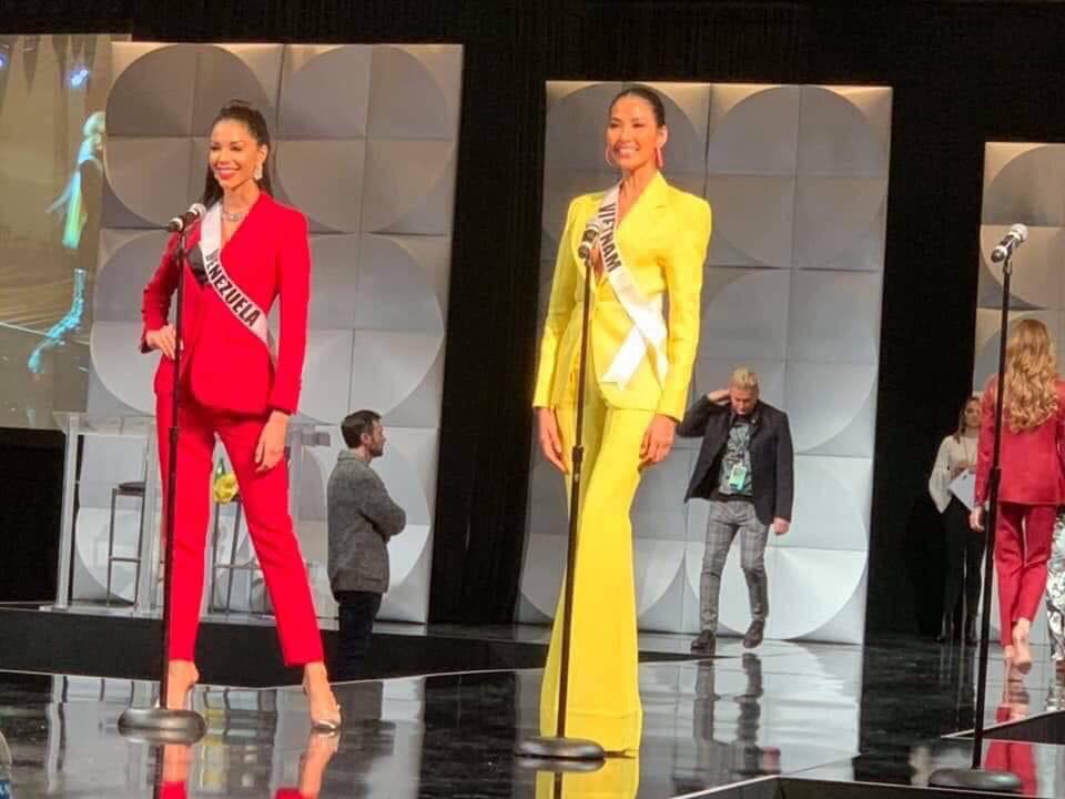 Sau vòng phỏng vấn kín, Hoàng Thùy không kịp thay đồ đã ngay lập tức tham gia vào buổi tổng duyệt, chuẩn bị cho đêm thi Bán kết vô cùng quan trọng diễn ra vào rạng sáng mai (07/12). Đứng cạnh đại diện Venezuela - đất nước được mệnh danh là cường quốc hoa hậu của thế giới nhưng Hoàng Thùy vẫn toả sáng “bần bật”, chiếm trọn spotlight bởi thần đầy thái tự tin và nhan sắc nổi trội.