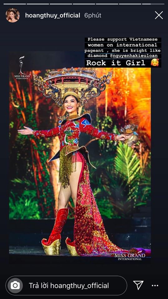 Trên trang cá nhân của mình, Hoàng Thùy đã chia sẻ bức ảnh Kiều Loan với bộ trang phục “Huyền đăng hội” cùng chia sẻ: “Xin hãy ủng hộ người đẹp Việt tham gia cuộc thi quốc tế. Em Nguyễn Hà Kiều Loan thực sự tỏa sáng như một viên kim cương.