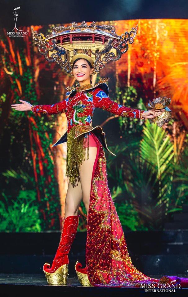 Tối ngày 21/10, phần thi Trang phục dân tộc - Miss Grand International 2019 đã diễn ra. Đại diện Việt Nam - Kiều Loan tỏa sáng, khiến nhiều người trầm trồ với National Costume “Huyền đăng hội”.