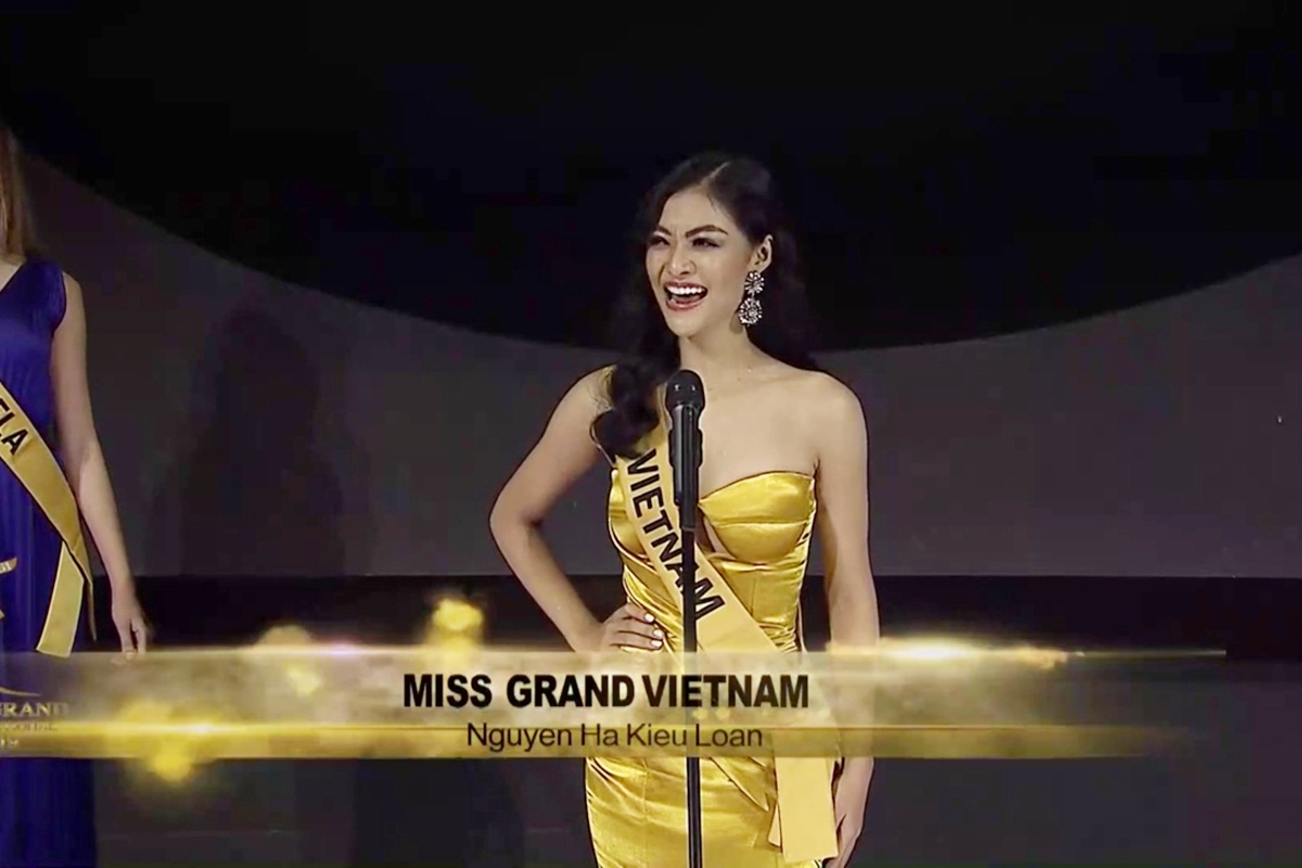Trong phần mở màn, tất cả thí sinh tranh vương miện Hoa hậu Hòa bình Quốc tế 2019 đã có màn ra mắt ấn tượng. Đại diện Việt Nam - á hậu Kiều Loan diện thiết kế dạ hội vàng nổi bật, đầy cuốn hút với mái tóc xoăn và tự tin sải bước trên sân khấu của sự kiện. Hô vang 2 tiếng Việt Nam, Kiều Loan là thí sinh sinh duy nhận được sự tán thưởng, ủng hộ vì thần thái rạng rỡ, tự tin.
