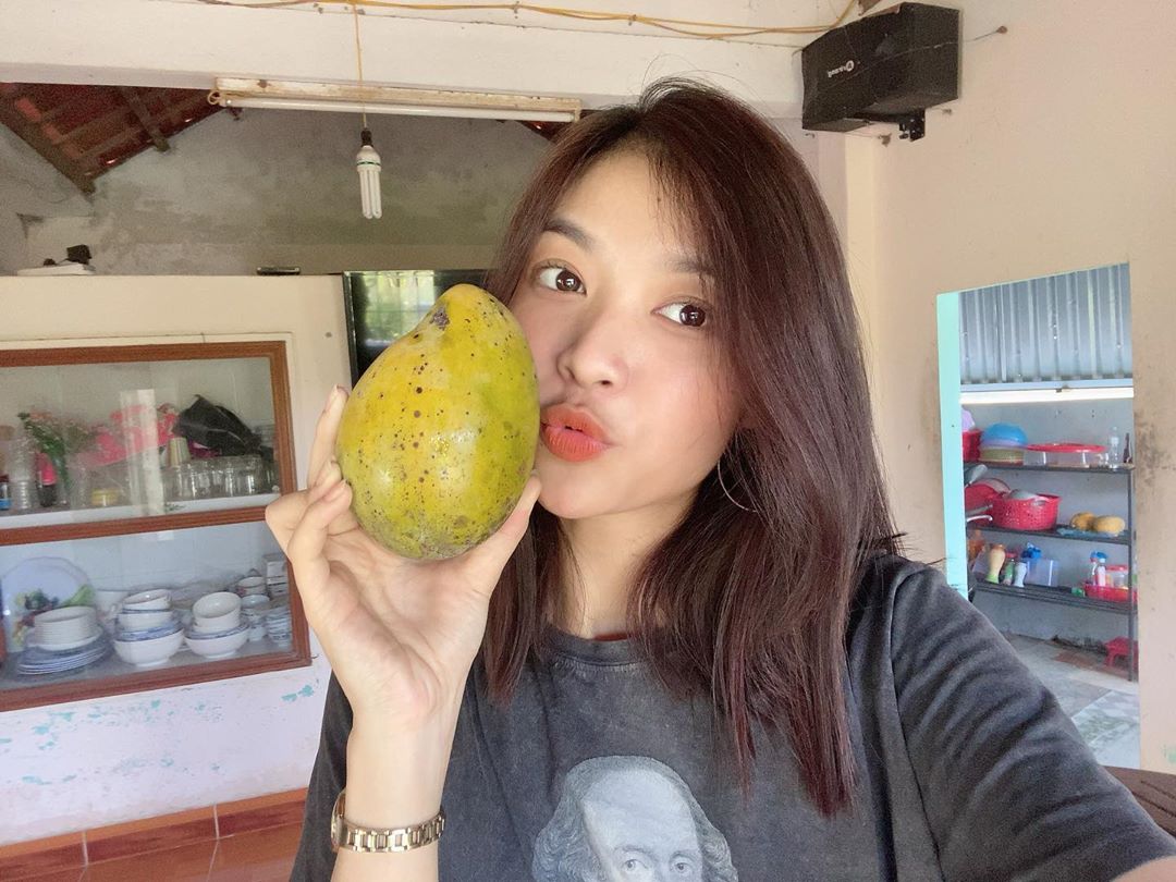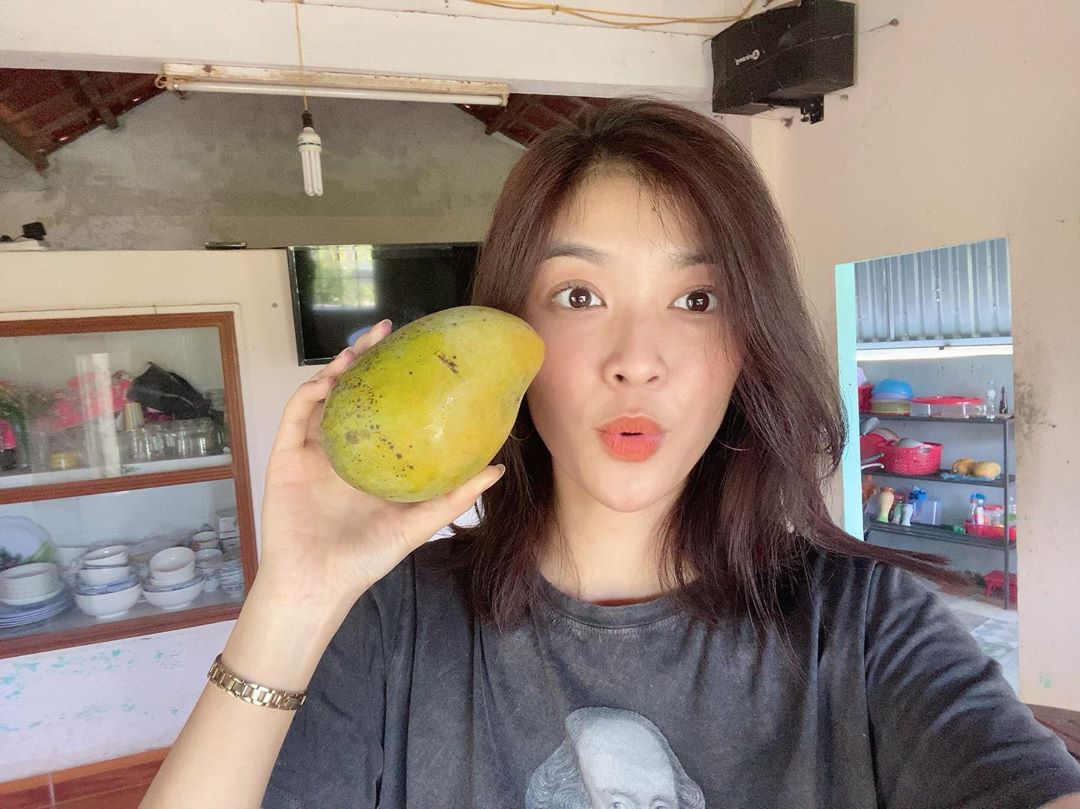 Nàng hậu rạng rỡ khoe trái cây vườn nhà.