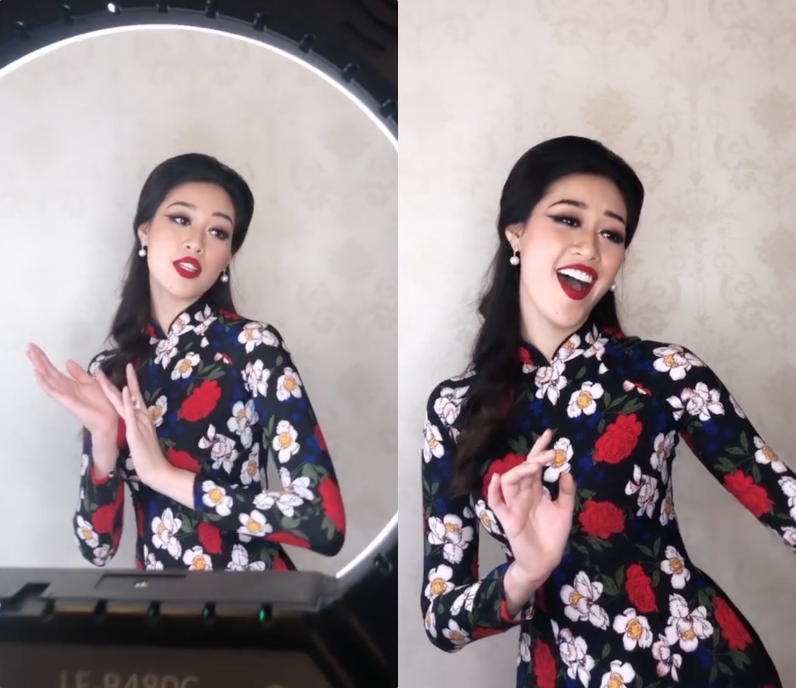 Hoa hậu Khánh Vân diện áo dài hoa cùng kiểu tóc và phong cách trang điểm cổ điển.