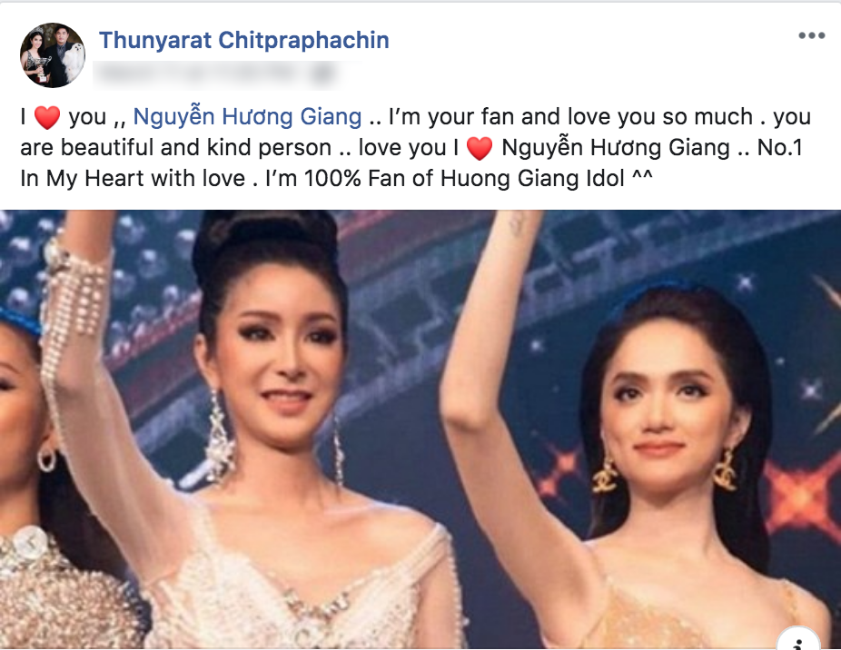 Chia sẻ dấu ấn đặc biệt lên trang cá nhân, người đẹp nhận được nhiều lời chúc mừng từ bạn bè đồng nghiệp, đặc biệt là Hoa hậu Chuyển giới Quốc tế 2007 - Tanyarat Jirapatpakon. Theo đó, cựu hoa hậu chuyển giới đến từ Thái Lan không chỉ ngưỡng mộ mà còn tự nhận mình là “fan cứng 100%” của giọng ca Anh đang ở đâu đấy anh. Hầu hết những bài báo và sản phẩm âm nhạc của Hương Giang đều được cô nàng chia sẻ lại trên trang cá nhân với nội dung tiếng Việt khiến fan thích thú.
