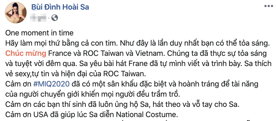 Về nhì trong phần thi Tài năng tại Miss international Queen 2020 với ca khúc One moment in time, Hoài Sa muốn truyền tải thông điệp: “Hãy làm mọi thứ bằng cả con tim. Như đây là lần duy nhất bạn có thể tỏa sáng”. Đại diện Việt Nam cũng gửi lời chúc mừng đến người đẹp Pháp và Đài Loan. Top 3 Best Talent Quest 2020 đã thực sự tỏa sáng và có một đêm diễn tuyệt vời. Đặc biệt, Hoài Sa còn bày tỏ sự cảm kích trước hành động đẹp của đại diện Mỹ khi cô nàng giúp á quân Chinh phục hoàn mỹ tránh sự cố trong phần thi trình diễn trang phục dân tộc.