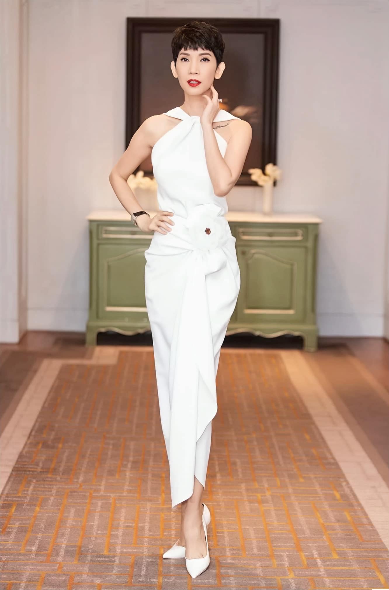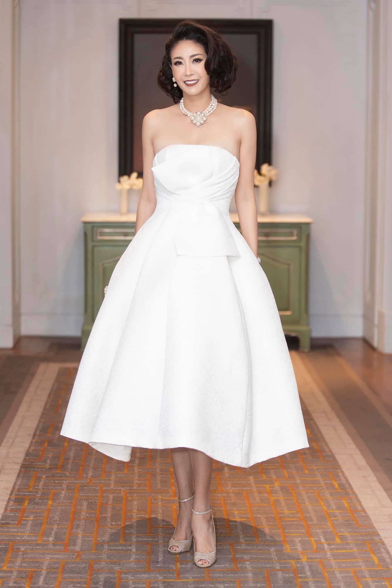 Siêu mẫu Xuân Lan nền nã với bộ cánh màu trắng cách điệu phần cổ áo giúp cô khoe trọn bờ vai hao gầy.