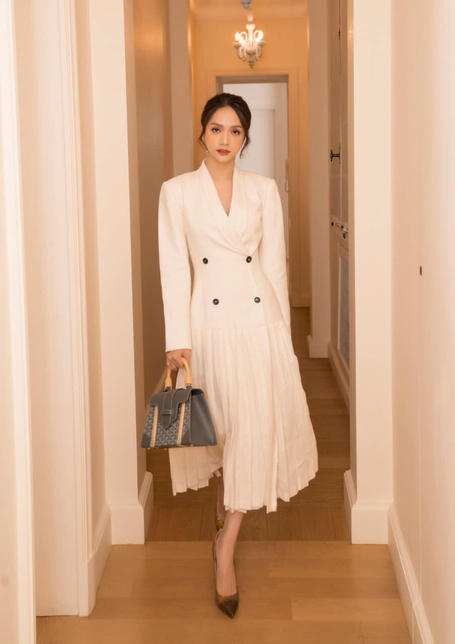Hoa hậu Hương Giang giữ vững phong độ thời trang đẳng cấp khi kết hợp áo vest cách điệu cùng đầm xếp ly. Cô khéo léo khi phối phụ kiện túi xách xuyệt tông cùng giày mũi nhọn vô cùng ăn nhập.