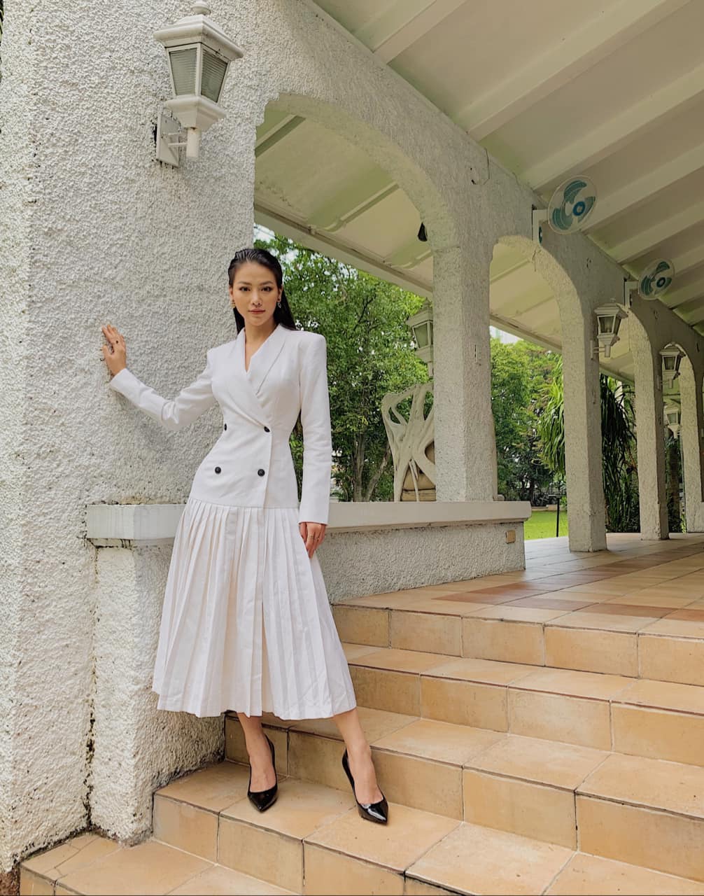 Ít khi thấy Minh Tú với phong cách thục nữ thiện thanh như lần này. Chiếc đầm form dáng midi bèo nhún tăng thêm vẻ đẹp “nhiều màu sắc” của cựu HLV The Face Vietnam 2017.