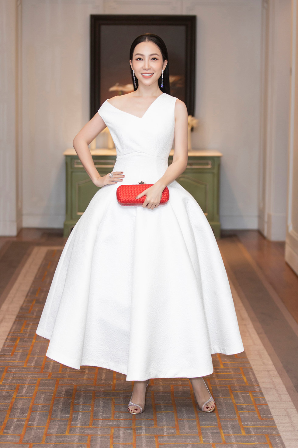 Lê Thúy đẹp “tròn trịa” với bộ cánh màu trắng kiểu dáng suông lệch vai. Son môi đỏ đậm, búi tóc cao là sự lựa chọn hoàn hảo cho sự xuất hiện lần này của chân dài gốc Quảng Bình.
