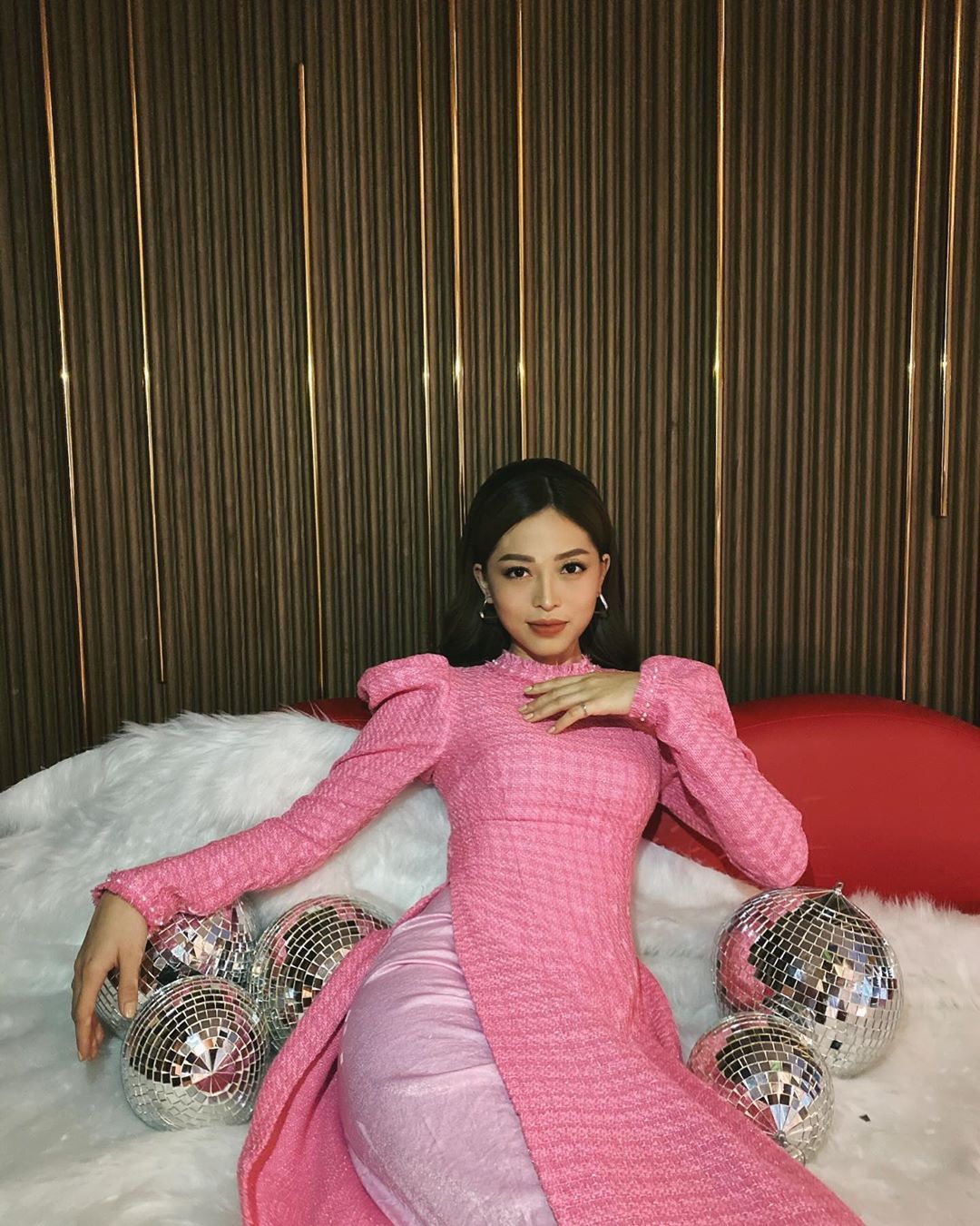 Á hậu Bùi Phương Nga diện áo dài thả dáng kết hợp disco ball. Người đẹp hỏi fan có giống nữ hoàng đu đưa không?