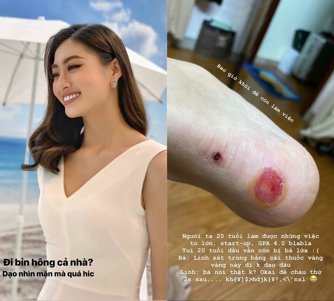 Lương Thùy Linh khoe nhan sắc mặn mà nhưng điều khiến fan quan tâm đó là gót chân của nàng hậu bị phồng da nặng. Phải mất một ít thời gian để vết thương hồi phục, người đẹp mới có thể làm việc trở lại trên đôi giày cao gót.