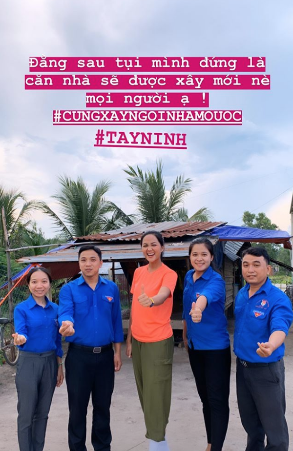 Hoa hậu H’Hen Niê mặc giản dị chụp ảnh kỷ niệm cùng các cán bộ Đoàn Thanh niên trong hoạt động cộng đồng “Cùng xây ngôi nhà mơ ước” giúp đỡ hộ gia đình khó khăn tại Tây Ninh.