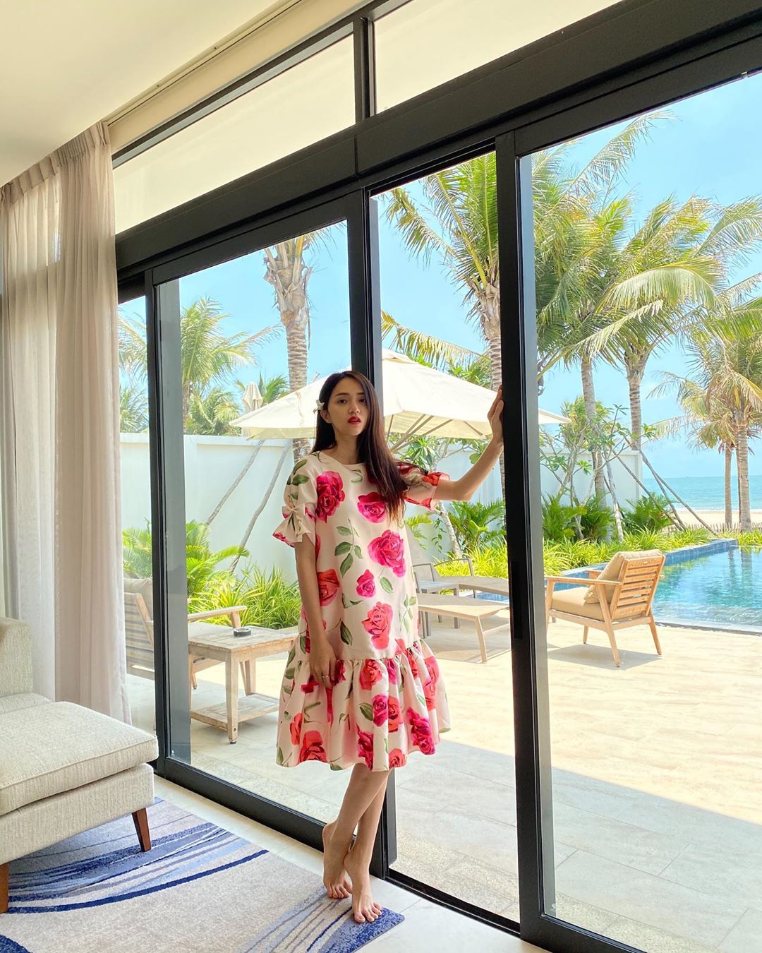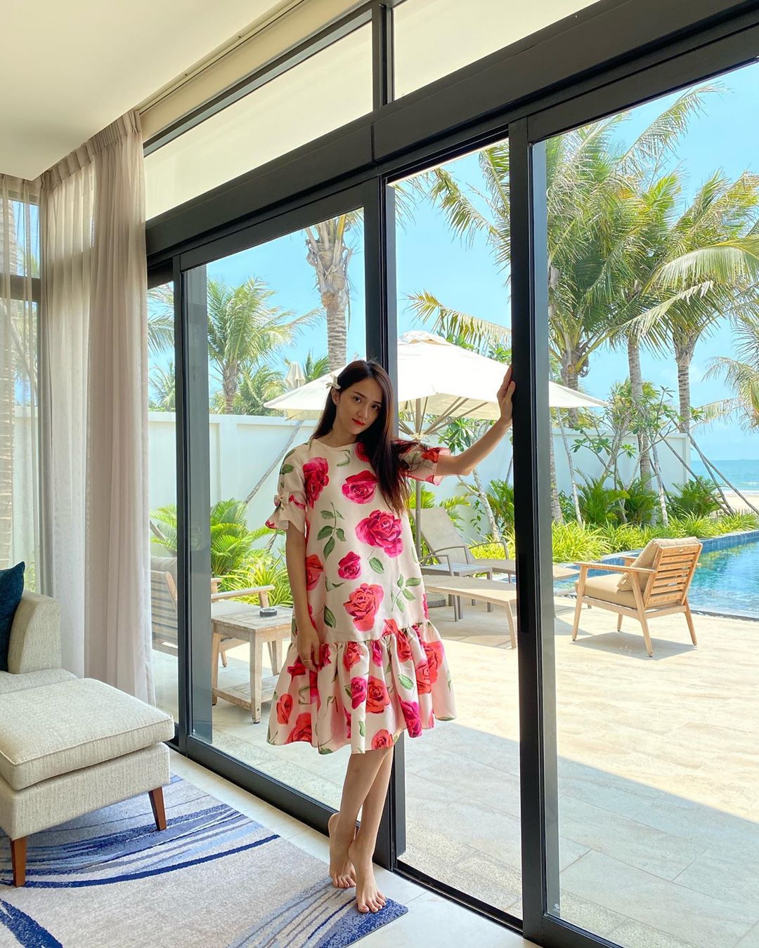 Hoa hậu Hương Giang khoe nhan sắc rạng rỡ trong chuyến đi nghỉ dưỡng tránh dịch.