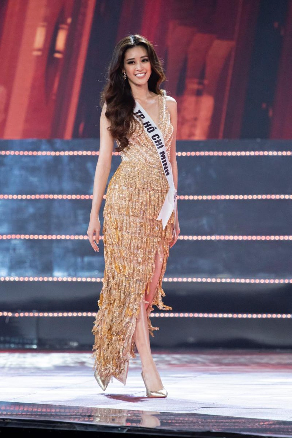 Bộ cánh dạ hội sắc vàng lấp lánh có form dáng ôm sát cơ thể giúp Khánh Vân đăng quang Miss Universe Vietnam 2019.