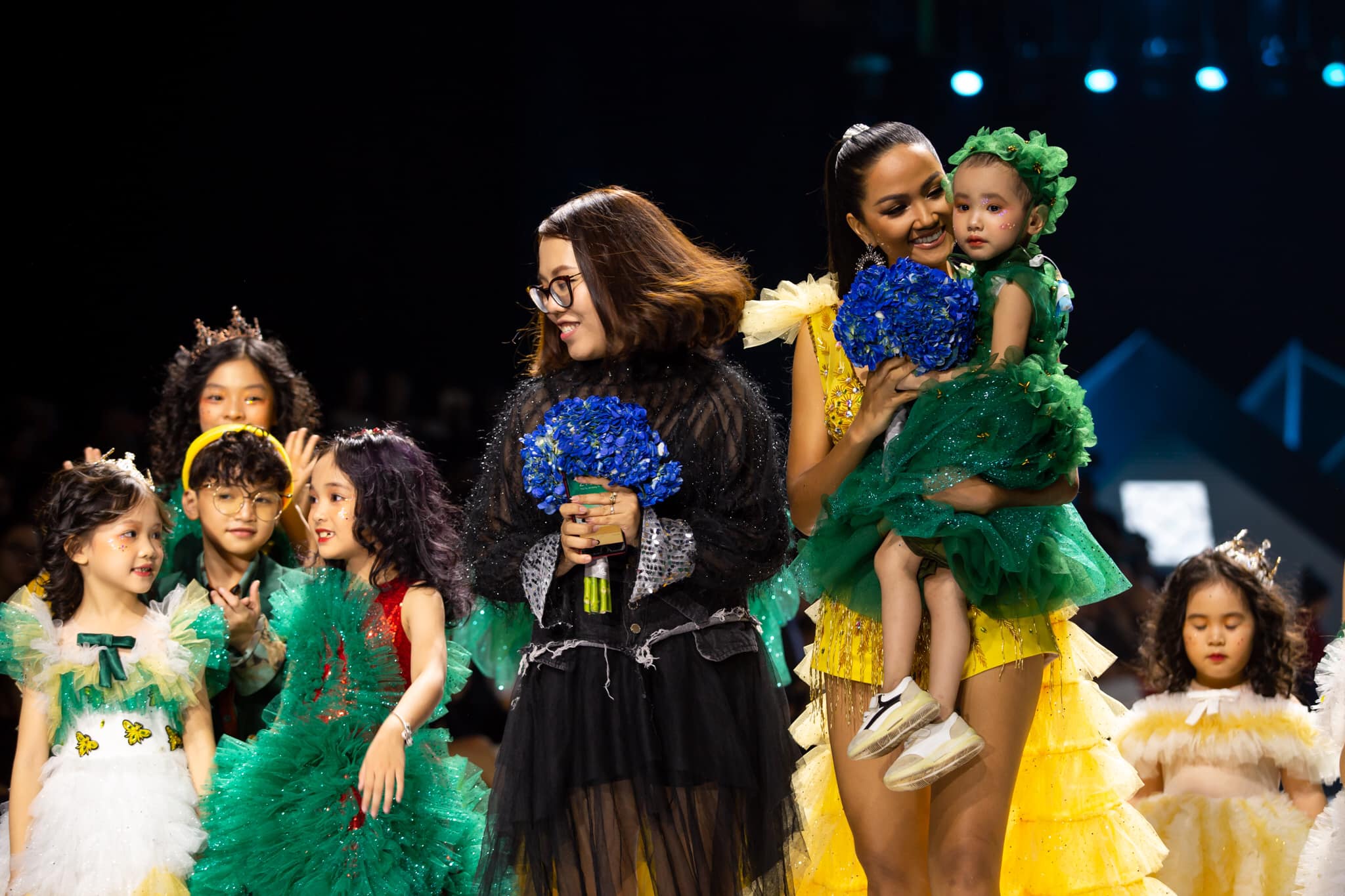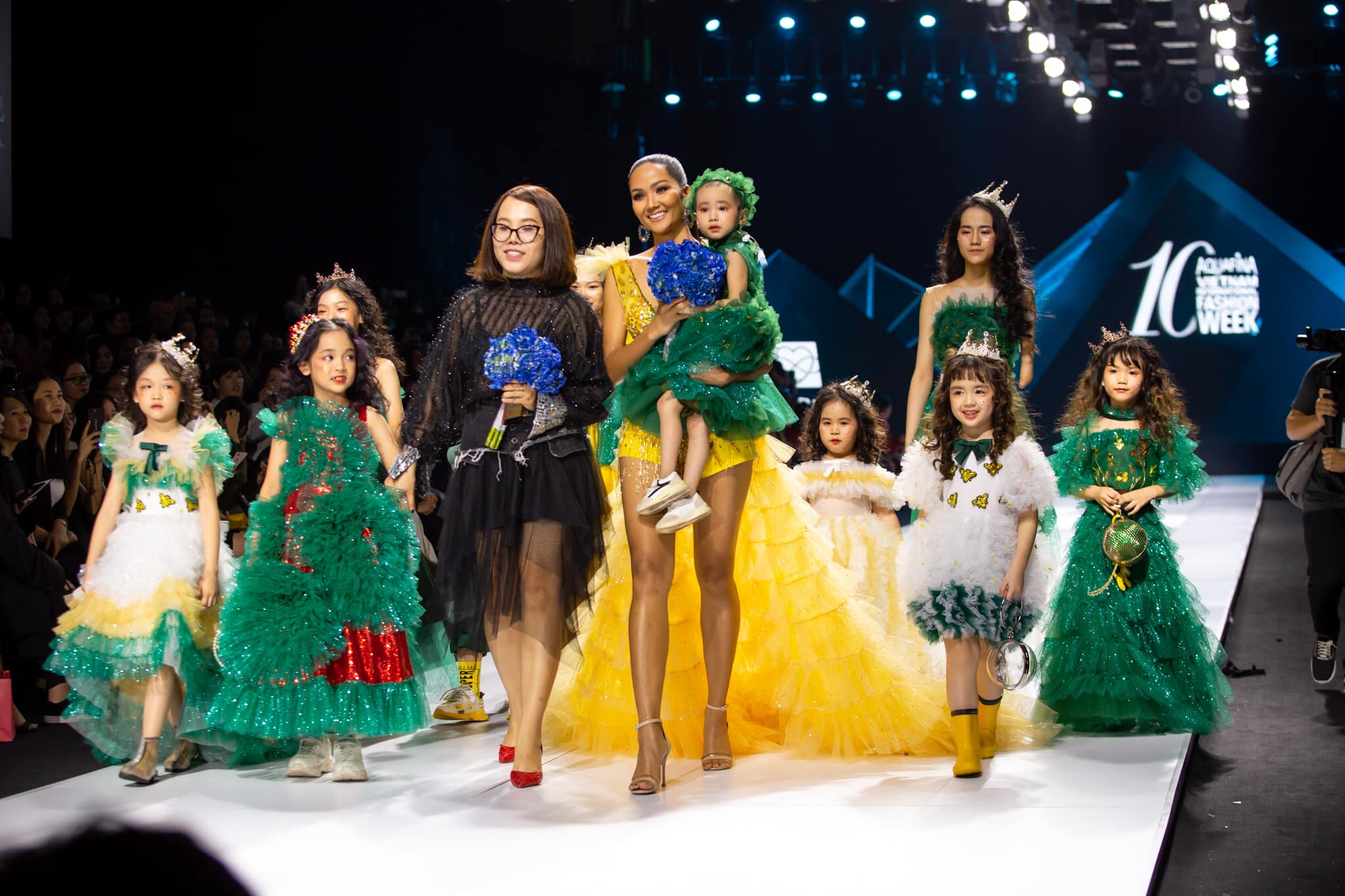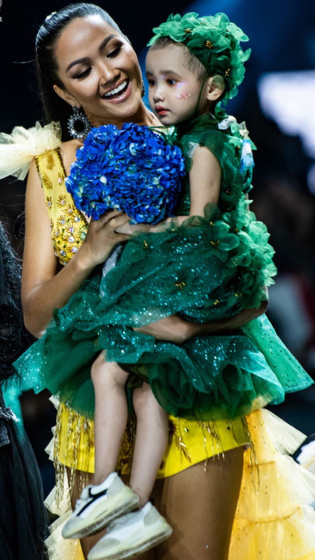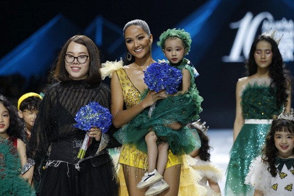 Trong show diễn đặc biệt, bé Hà My khoác lên người bộ váy màu xanh của hy vọng, xuất hiện rạng rỡ trong vòng tay của H'Hen Niê.