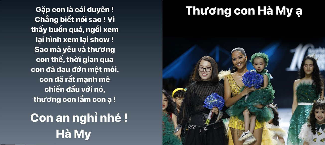 Sau khi nhận được tin bé Hà My - người mẫu nhí 5 tuổi từng trình diễn với mình trong bộ sưu tập của nhà thiết kế Thảo Nguyễn qua đời sau một thời gian dài chống chọi với căn bệnh ung thư máu, Hoa hậu Hoàn vũ Việt Nam 2017 - H'Hen Niê bày tỏ lòng tiếc thương sâu sắc. Người đẹp Ê Đê xúc động chia sẻ: “Gặp con là cái duyên, chẳng biết nói sao. Vì thấy buồn quá ngồi xem lại hình, xem lại show. Sao mà yêu mà thương con thế. Thời gian qua con đã đau đớn, mệt mỏi. Con đã rất mạnh mẽ chiến đấu với nó, thương con lắm con ạ. Con an nghỉ nhé Hà My”.