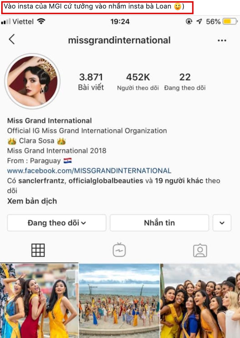 Fan Việt hóm hỉnh chia sẻ hình ảnh Instagram của Miss Grand International tràn ngập ảnh Kiều Loan.