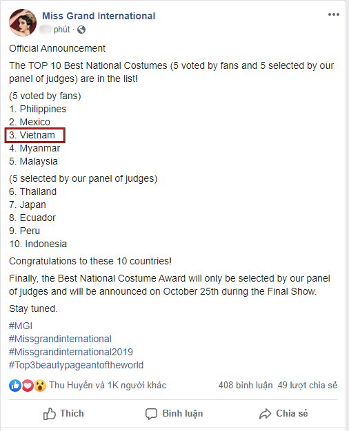 Ấn tượng hơn khi trong danh sách, Á hậu Kiều Loan giữ vị trí thứ 3 với “Huyền đăng hội” chỉ sau Philippines và Mexico.