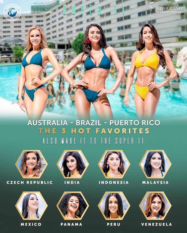 Vị trí Top 3 xuất sắc nhất cũng có sự biến động nhẹ khi mỹ nhân Malaysia bị người đẹp Australia “soán ngôi”. Trong khi đó, đại diện Brazil và Puerto Rico giữ vững phong độ làm chủ bảng xếp hạng qua nhiều tuần liền. Theo quan điểm của Global Beauties, chuyên trang này dường như đánh giá cao các đại diện đến Âu - Mỹ hơn, vì châu Á - Thái Bình Dương khi chỉ có 3 đại diện xuất hiện trong danh sách lần này.