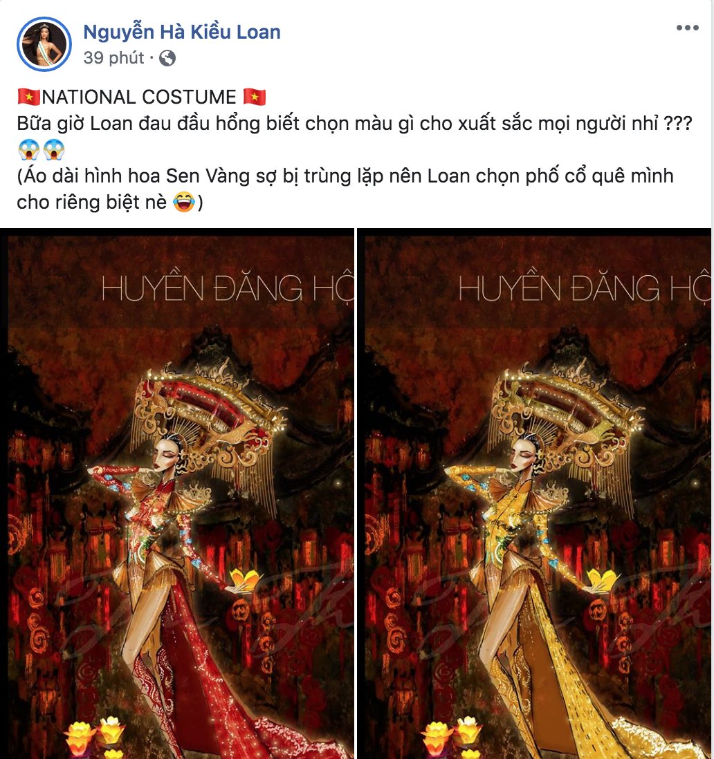 Mới đây, á hậu Kiều Loan chia sẻ hình ảnh bản thiết kế trang phục dân tộc và nhờ người hâm mộ tư vấn lựa chọn màu sắc. Cộng đồng fan sắc đẹp vô cùng bất ngờ khi được chiêm ngưỡng National Costume lộng lẫy, ấn tượng mà đại diện Việt Nam mang đến Miss Grand International 2019. Không ít bình luận vừa hào hứng vừa lo lắng thiết kế độc đáo này liệu có hoàn thành kịp để cùng Kiều Loan lên đường sang Venezuela dự thi.