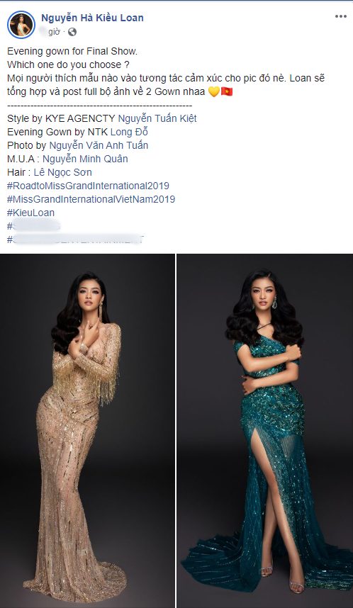 Mới đây, cô nàng lại tiếp tục khiến fan phấn khích khi chia sẻ 2 hình ảnh váy dạ hội và nhờ cộng đồng người hâm mộ chọn lựa giúp mình 1 bộ cánh ấn tượng để trình diễn cho đêm Chung kết. Mỗi trang phục đều có nét đẹp riêng, với nhiều chi tiết cầu kì, hoành tráng và hết sức lộng lẫy. Để có phần trình diễn lôi cuốn, ghi dấu ấn cho người xem, Kiều Loan luôn chăm chút, kĩ lưỡng cho vẻ bề ngoài của mình trước mỗi đêm thi.