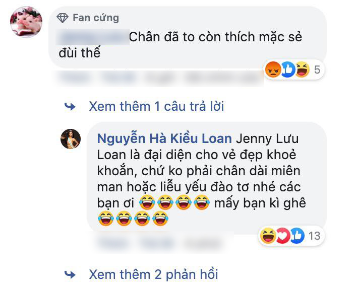 Theo đó, hình ảnh Kiều Loan diện trang phục dạ hội tua rua với phần đùi xẻ cao và pose dáng thần thái trong sự kiện công bố vương miện mới của cuộc thi Hoa hậu Hòa bình Quốc tế 2019 bị “bôi bát” bởi bình luận kém duyên. Anti-fan không ngại chia sẻ với thái độ mỉa mai: “Chân đã to còn thích mặc xẻ đùi thế”.