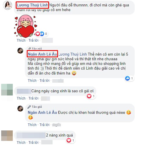 Từng yêu quý Lương Thùy Linh nhưng không có cơ hội tái hợp ở quê nhà. Bất chấp thời tiết giá lạnh Lê Âu Ngân Anh có mặt để tiếp lửa và tỏ ra rất ngưỡng mộ tinh thần chiến đấu và sự thể hiện tuyệt vời của đại diện Việt Nam ở đấu trường Miss World năm nay. Vẻ đẹp của Lương Thùy Linh đã khiến cô phải ngưỡng mộ: “Cô Linh nhà ta vẫn khoẻ, xinh xắn rạng rỡ và đang dồn sức lực cũng như năng lượng cho chặng đường cuối. Chỉ là cô Linh thèm đồ ăn Việt lắm rồi nè nên mọi người cứ hứa hẹn chầu ăn cho Linh có động lực nha”