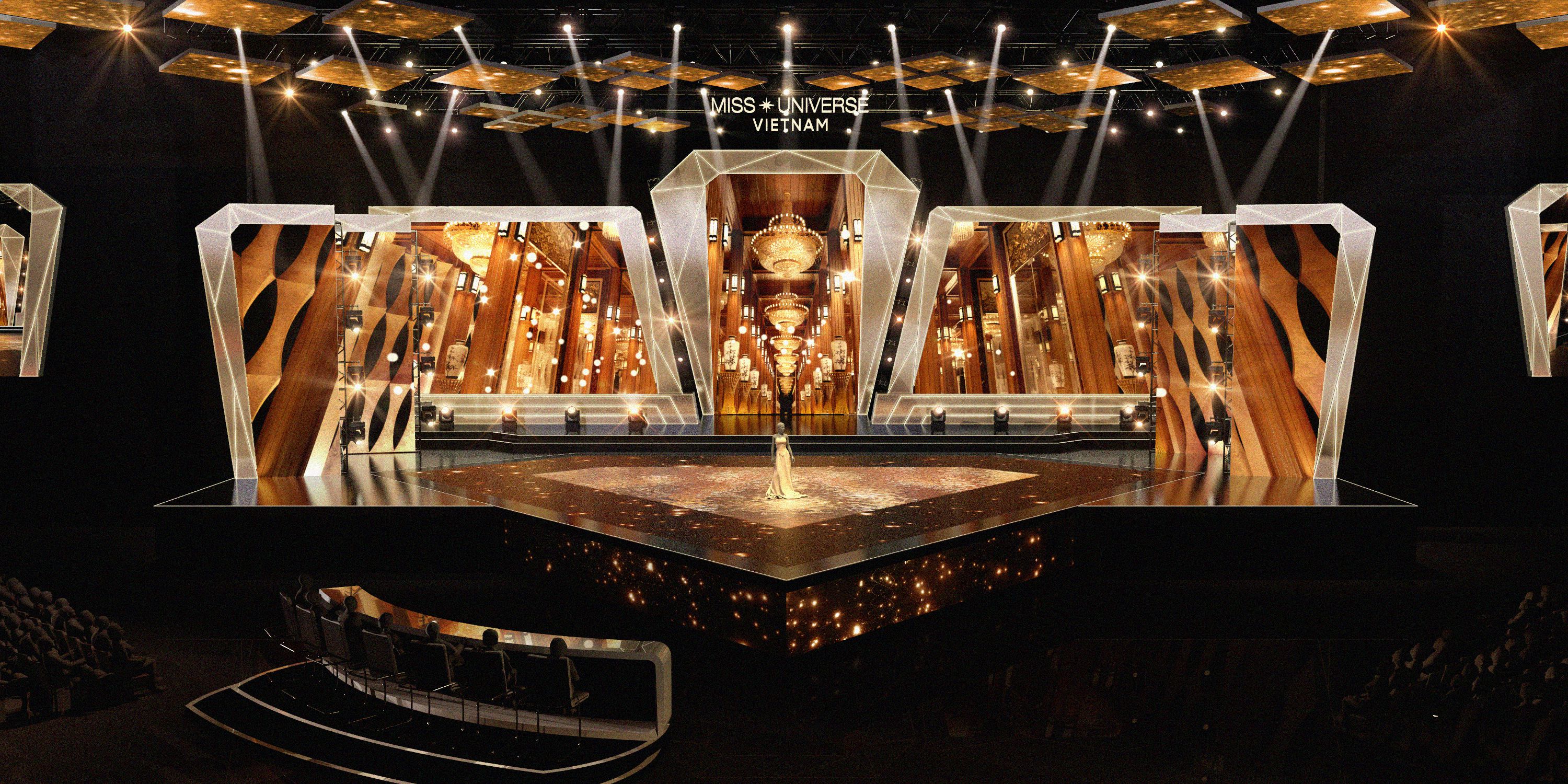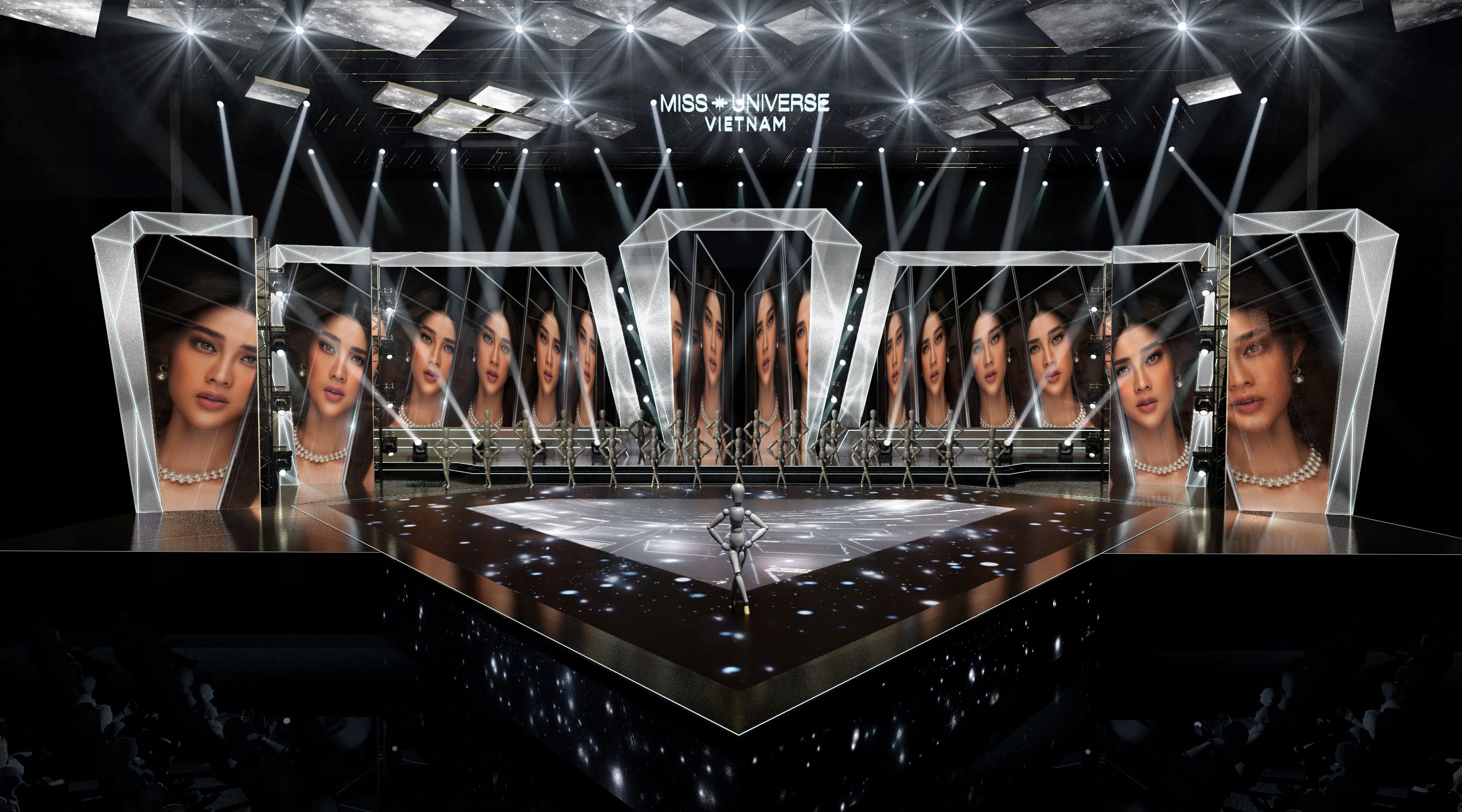Bên cạnh đó, màn hình LED từ trung tâm sân khấu đến khu vực cánh trái và cánh phải được đầu tư nhiều hiệu ứng sát với xu hướng hiện đại của các cuộc thi nhan sắc nổi danh trên thế giới - Miss Universe.