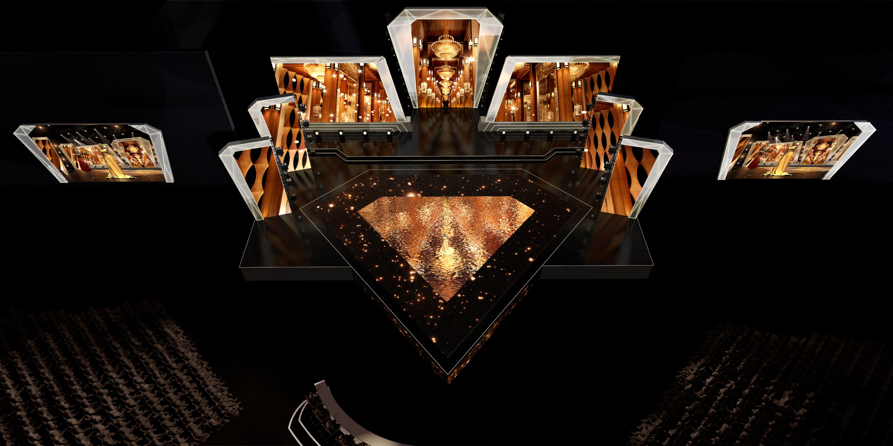 Sàn catwalk nhìn từ trên cao với hình ảnh rõ nét của viên kim cương sáng lấp lánh.