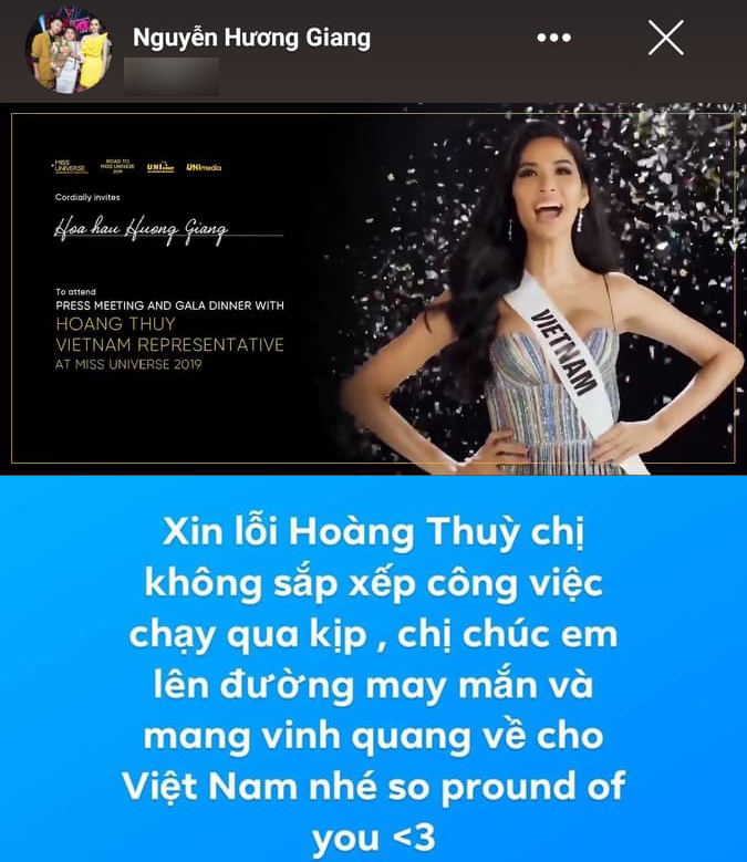 Hương Giang cho biết nàng hậu được mời đến “Send-Off Party” để chứng kiến khoảnh khắc đàn em Hoàng Thùy được đeo sash đại diện Việt Nam dự thi Miss Universe 2019. Hoa hậu Chuyển giới Quốc tế 2018 bộc bạch: “Xin lỗi Hoàng Thùy, chị không sắp xếp công việc để chạy qua kịp, chị chúc em lên đường may mắn và mang vinh quang về cho Việt Nam. Chị tự hào về em”.
