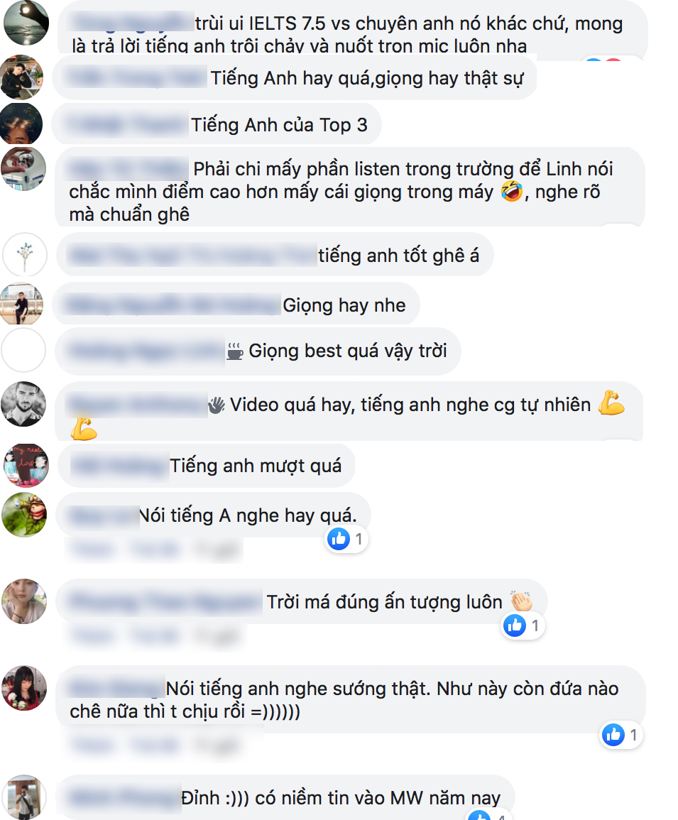 Phần đông khán giả “trầm trồ” với chất giọng nói tiếng Anh của Lương Thùy Linh đồng thời tin tưởng vào khả năng giao tiếp của đại diện Việt Nam khi tham gia đấu trường nhan sắc quốc tế.