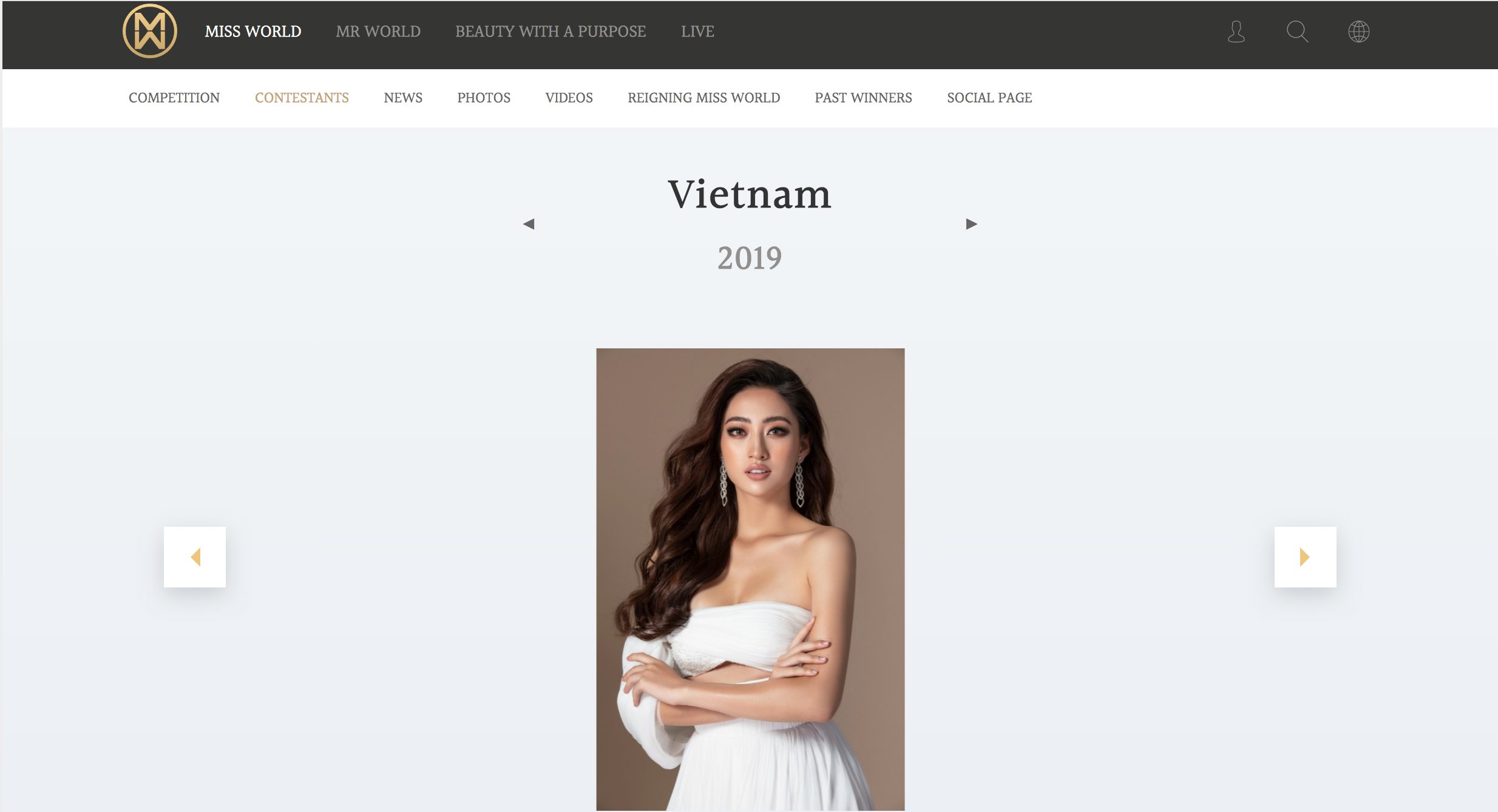 Sau thời điểm công bố Miss World 2019 lần thứ 69 được tổ chức tại Anh gây chú ý với fan sắc đẹp trên toàn thế giới, mới đây, trang chủ cuộc thi tiếp tục tung ra “profile” của đại diện các nước. Trên website chính thức của Hoa hậu Thế giới, hình ảnh của đại diện Việt Nam - hoa hậu Lương Thùy Linh xuất hiện vô cùng nổi bật khiến người hâm mộ tự hào.